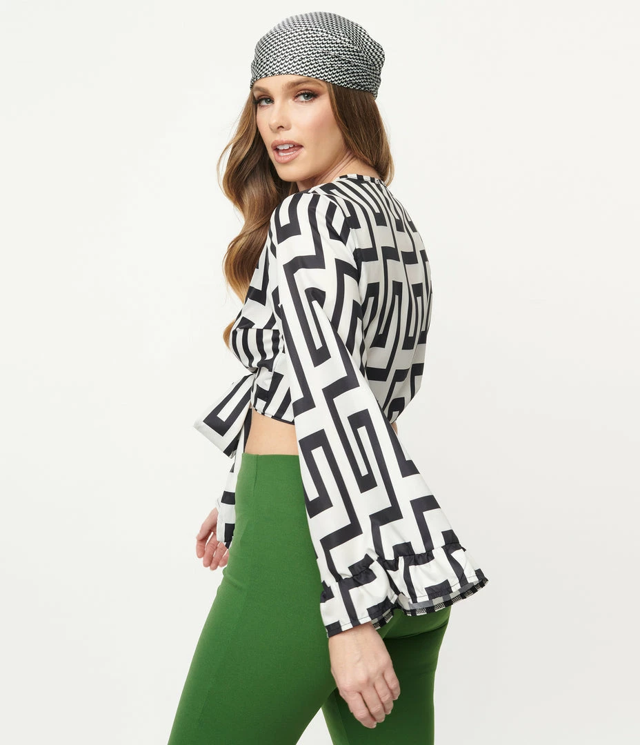 Send their hearts into overdrive, dames! Sizzle on the scene in this eye-catching separate, crafted in a smooth and lightweight woven blend that dances with a black and white geometric print throughout. The sexy, cropped front is secured with attached ties for a self tie bow while the long sleeves drop into a ruffled peplum cuff!
