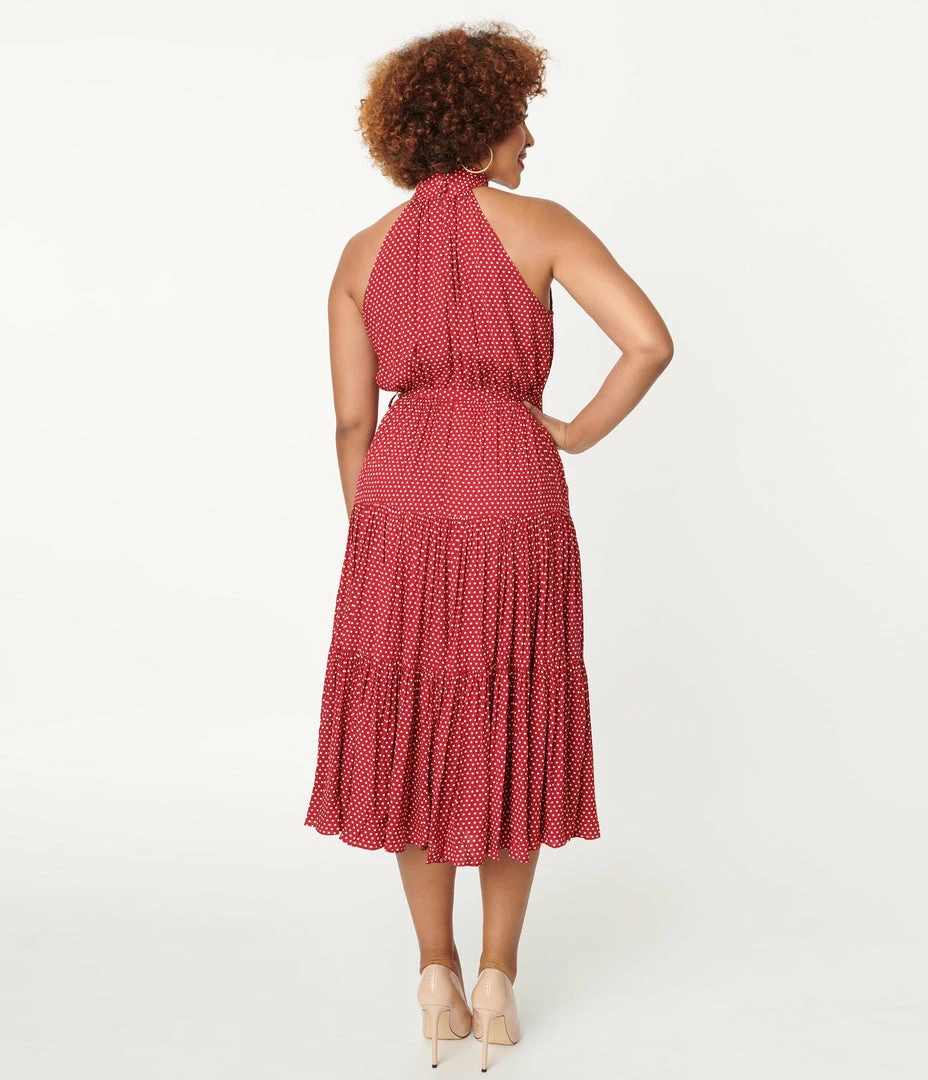 Let the dots lead the way, darling! This adorable vintage style frock is an eye-catching piece, crafted in a woven blend that dances with white polka dots throughout the red backdrop. The halter neckline is secured with a back zipper and buttons while the sultry sleeveless style shows off your shoulders. The elastic waist and self tie sash nip in your form while the gathered 3 tier skirt drops below your knees!