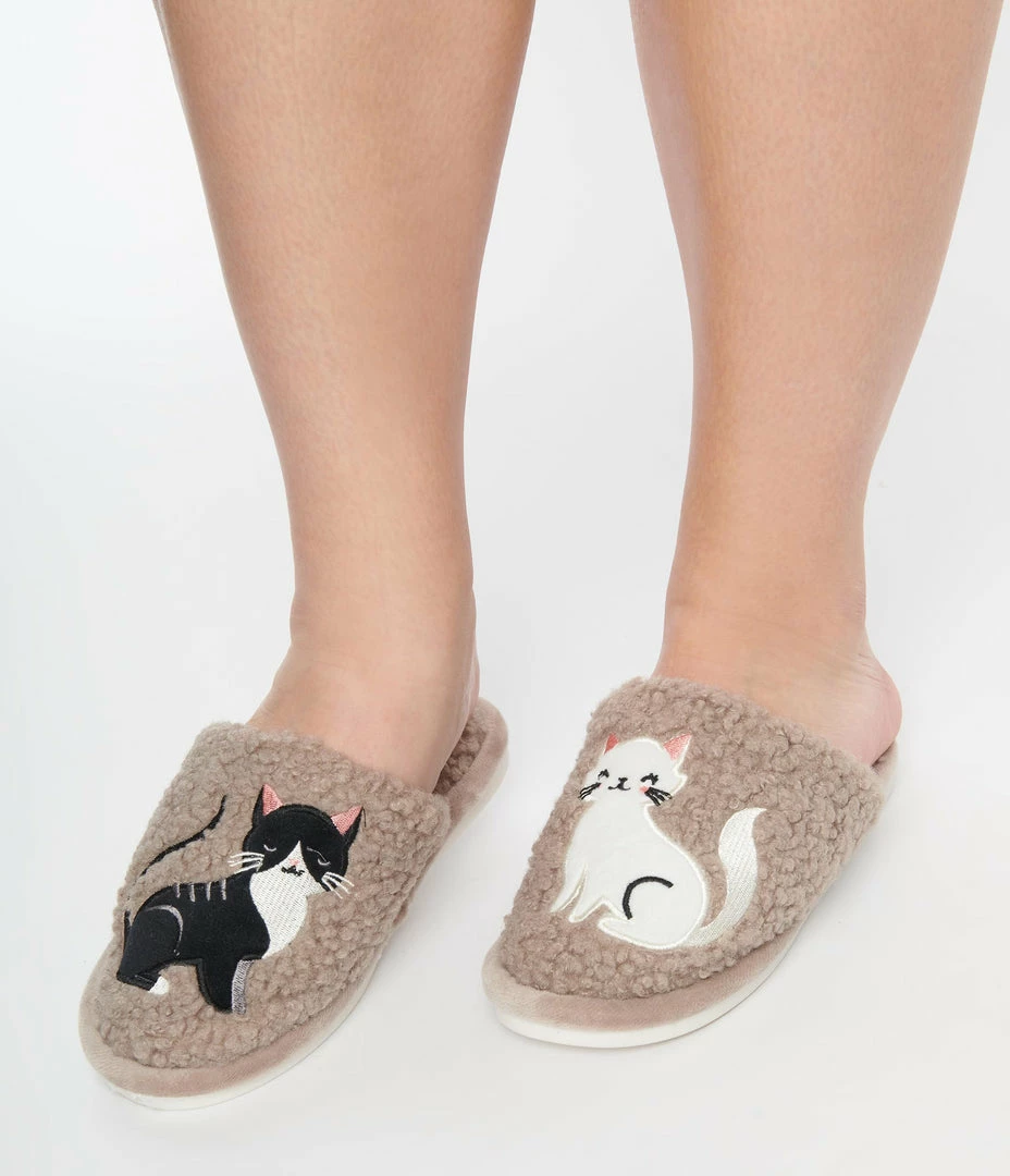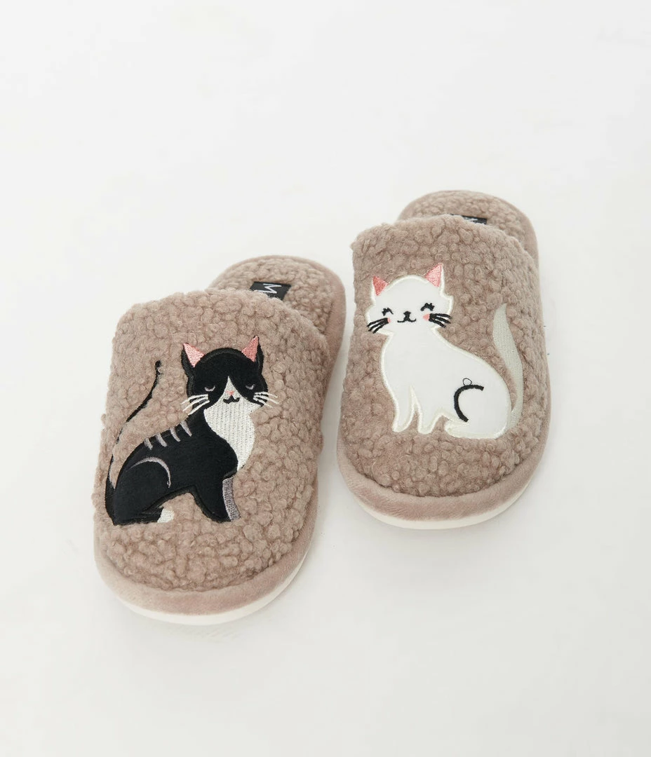 Keep your feet warm, but cute on your lazy days with these adorable and comfy kitten plush slippers. Made of a soft, brown fuzzy material featuring an embroidered pair of the prettiest kittens, complete with a non skid bottom.