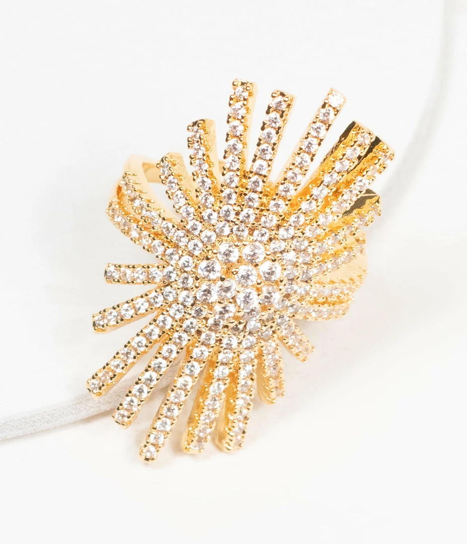 Make a sparkling statement! This gorgeous accessory adds a dazzling flair to your vintage ensemble with twinkling silver rhinestones set in intricate golden hardware. With an adjustable ring to suit your every whim!