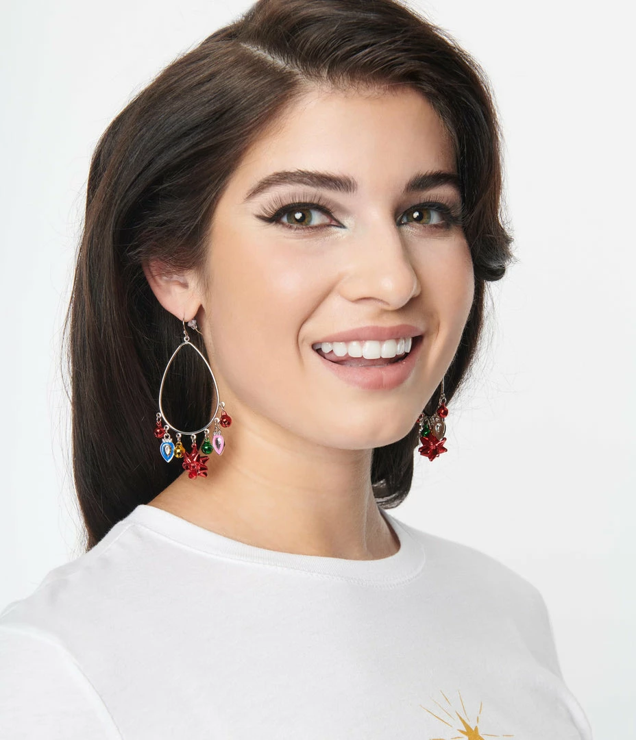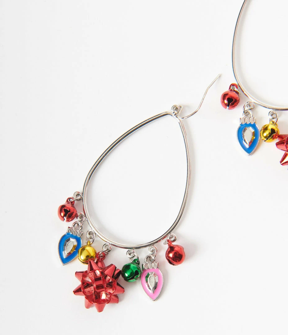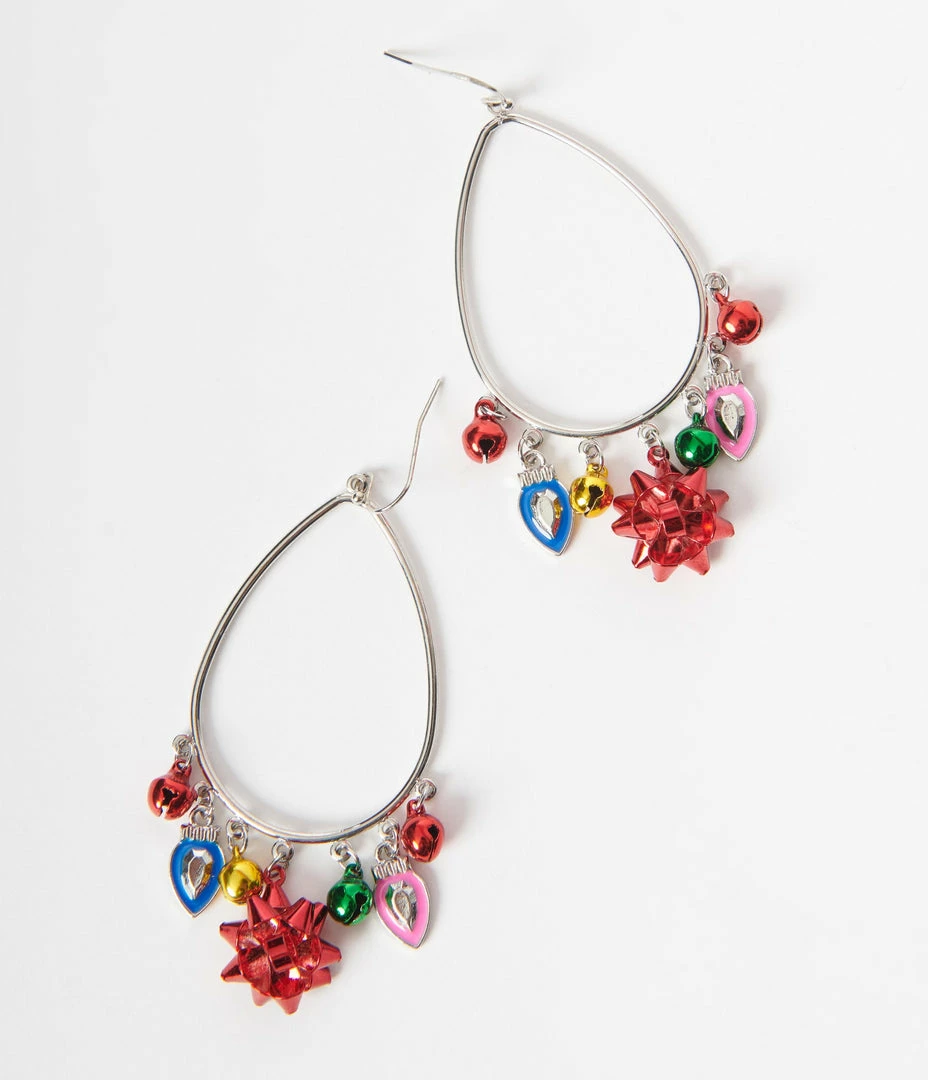 These joyful earrings are crafted in silver hardware with multicolor jingle bells and lights dangling along a gift bow. Complete with a hook back!