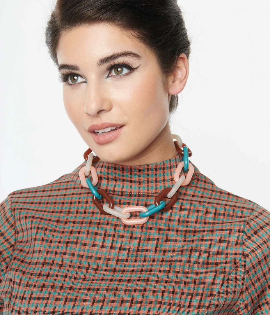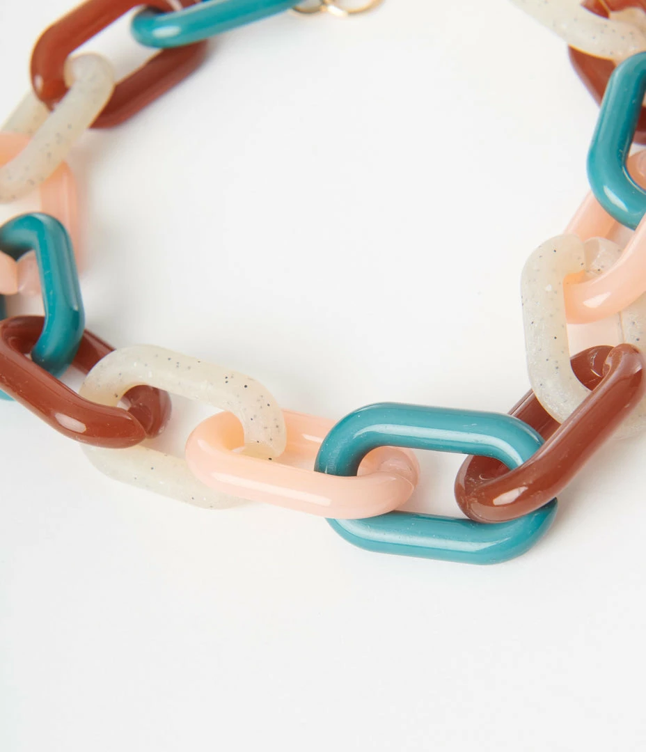 This sweet necklace is crafted in chunky acrylic chain links in shades of rust rest, pink, blue, and white, and secured with a lobster clasp!