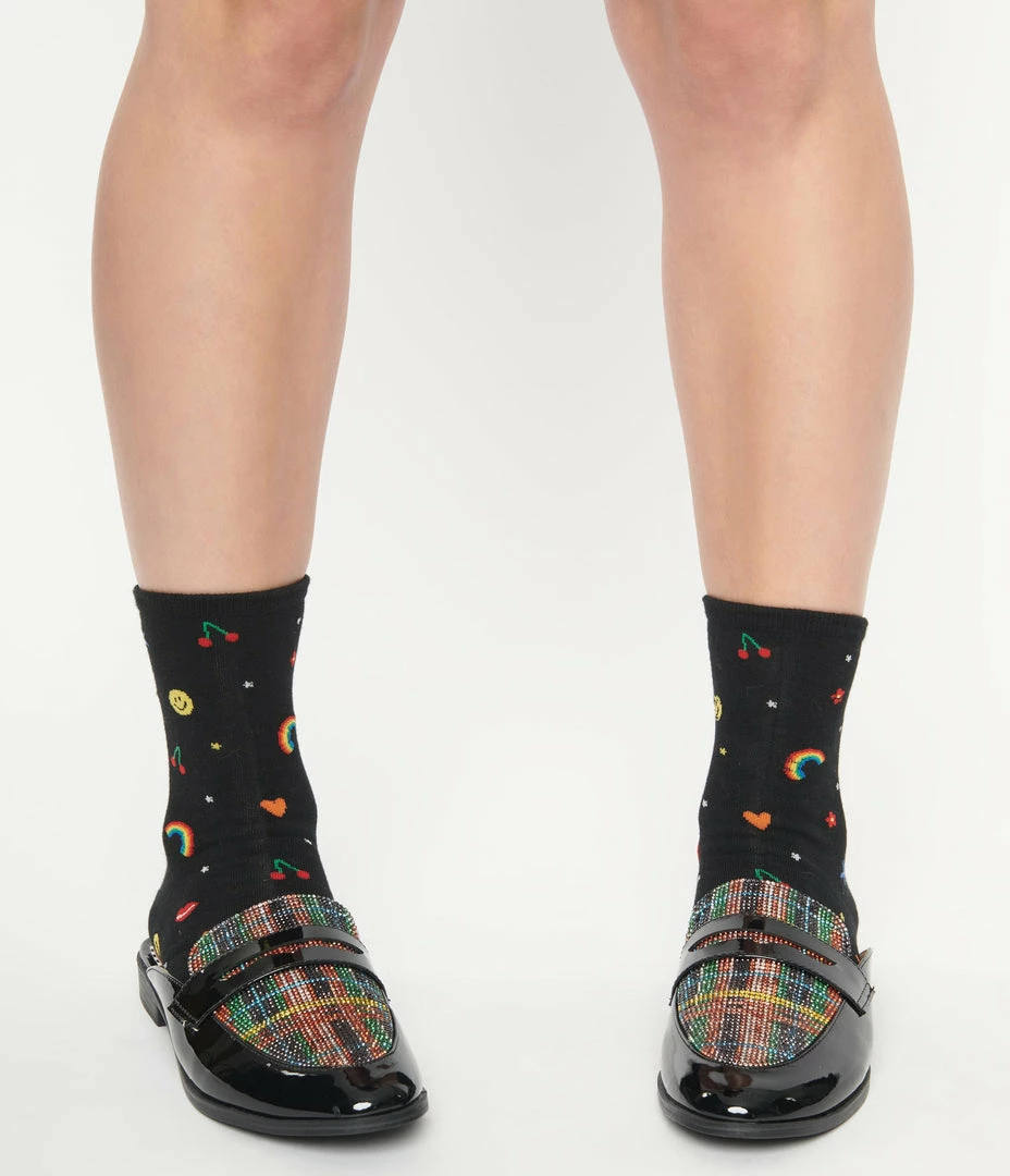 These charming socks are set in a fun print of emoji rainbows, smiley faces, hearts, and flowers dancing throughout the black backdrop, with a covered toe, heel, and cuff!