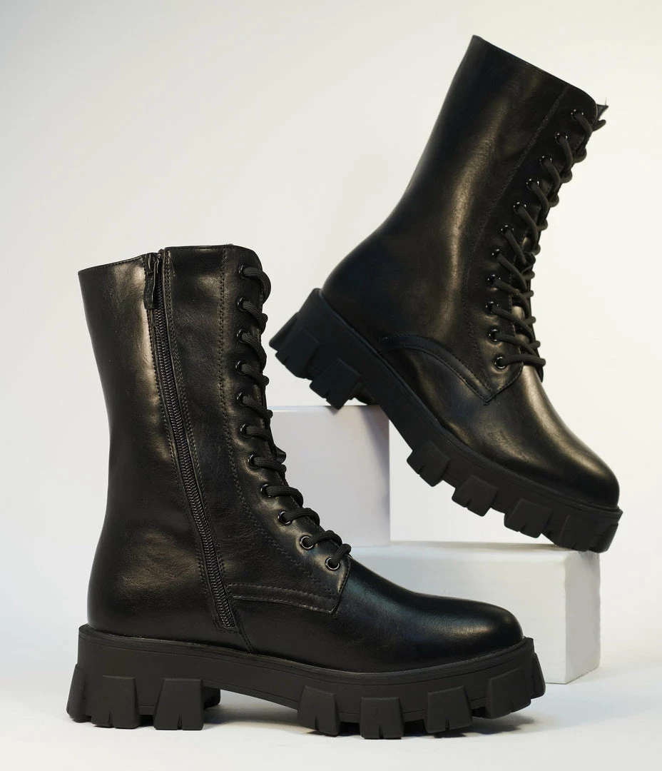 A commanding pair of combat boots, this black leatherette footwear is perfect for icy or muddy conditions with thick tread and tall shaft. The lace up front, side zipper, and pull tab give secure wear while the 2 inch heel adds a dash of lift. Complete with a cushion insole, you call the shots!