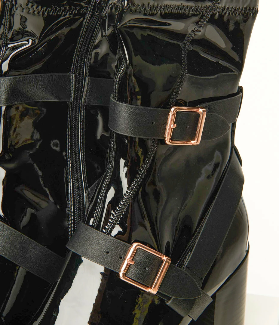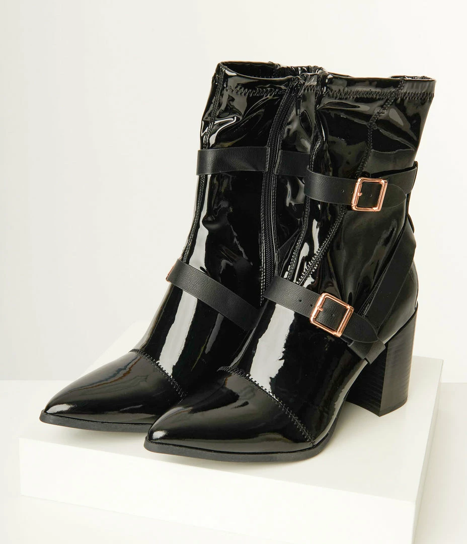 These gleaming black booties, crafted in patent leatherette, featuring a sturdy 3.5inch block heel and attached buckle straps. Secured with a side zipper and comfortable with a cushioned insole, provide some edge to your ensemble with the pointed toe!