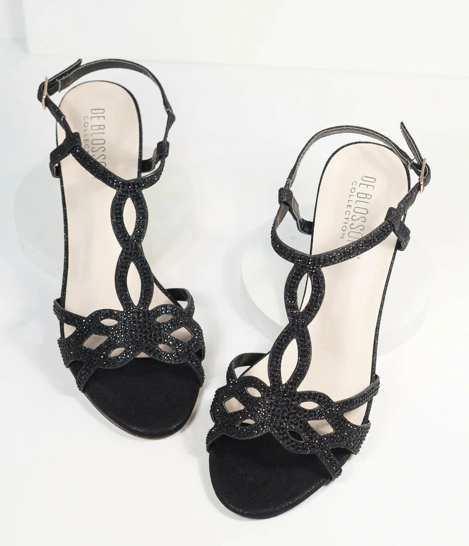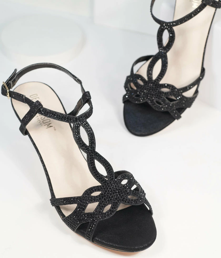 Canโt stop these kicks! These dazzling heels are crafted in a black leatherette and boast glittery black rhinestones throughout. The sultry peep toe vamp showcases your toes with cutout and keyhole designs while the figure eight T- strap connects to the buckle adjustable ankle strap and the lovable 2.5 inch kitten heel keeps you feeling feminine!
