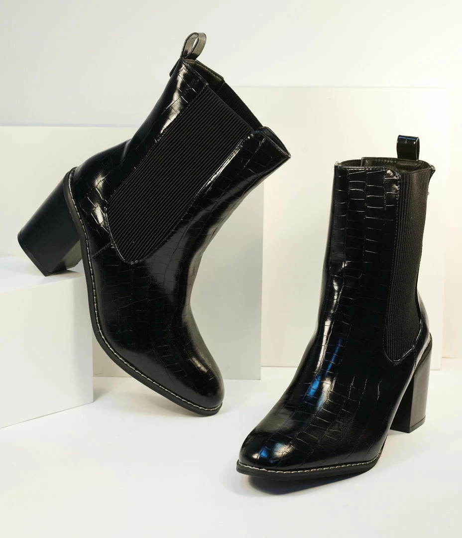 Sharpen your wardrobe with these statement making booties, crafted black patent leatherette with an embossed reptile pattern throughout. The gored, elastic sides lend and secure cinch while the 3.5 inch block heel provides a dramatic lift. Complete with a cushion insole!