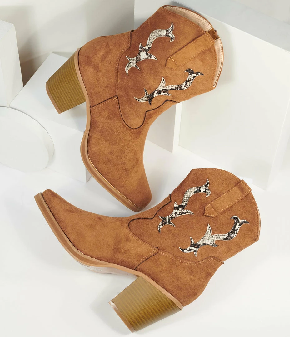 Show off your home roots, gals! These classic barn raising kicks are crafted in a fabulous brown faux suede and features seamed western embellishments throughout, including snakeskin embossed leatherette appliques. The pointed toes and 3 inch heels keep you feeling feminine. Complete with a cushion insole, and side zipper!