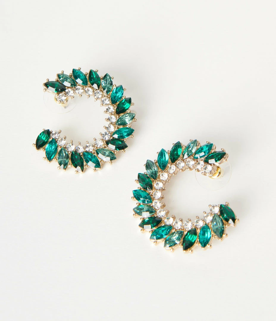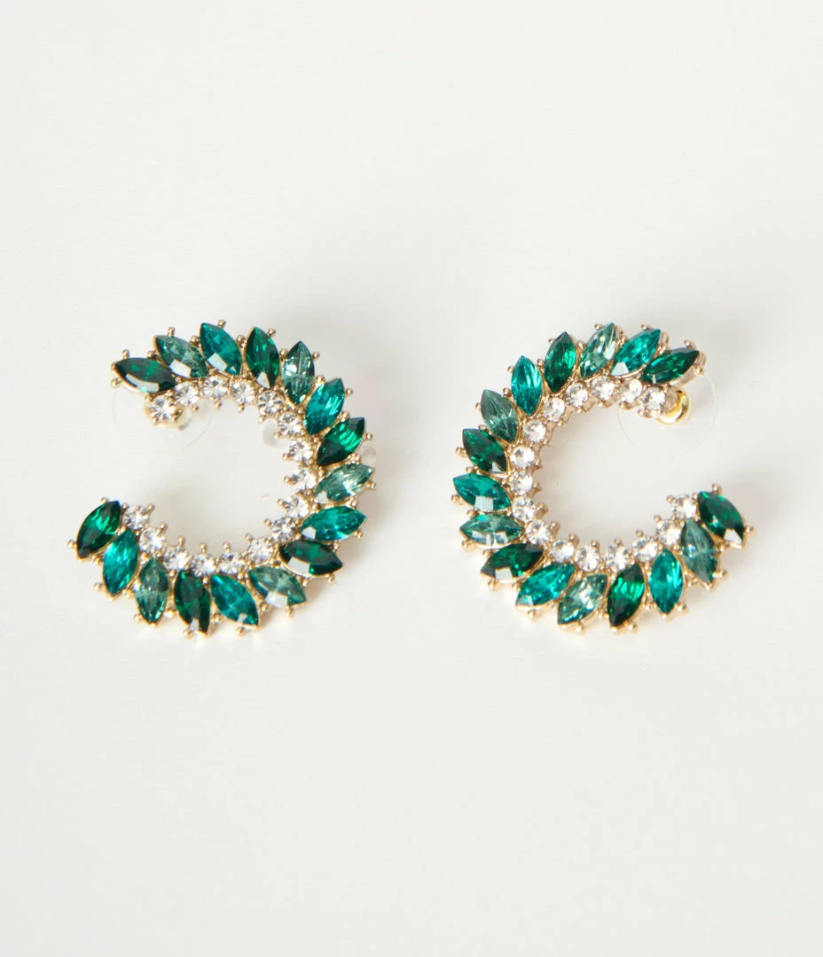 Keep it regal with these dazzling stud earrings, secured with a post back and crafted with emerald and silver rhinestones creating a leaf pattern!