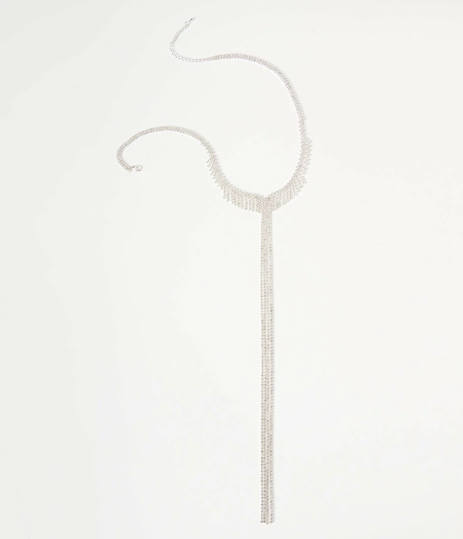 This stunning necklace boasts sparkling rhinestones secured in silver hardware and set in a fringe lariat style long necklace.