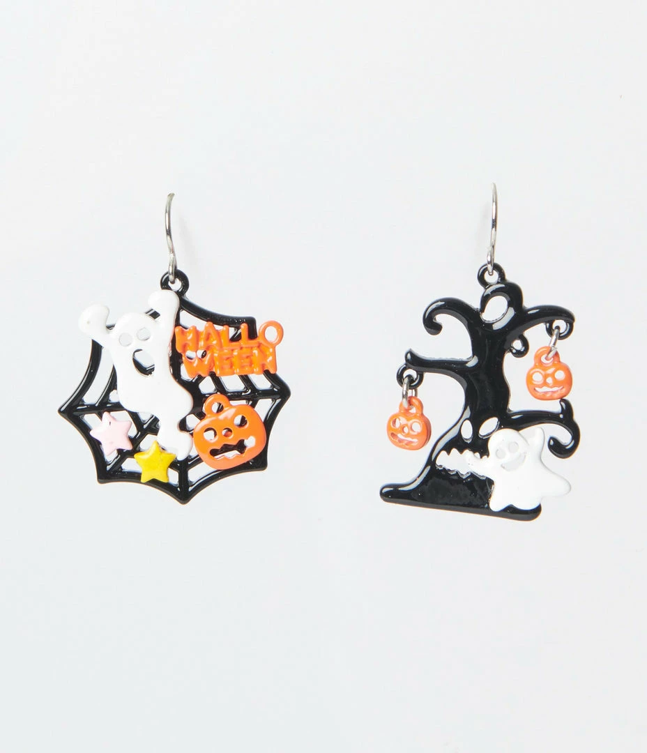 These spooky drop earrings feature some celebrating Halloween ghosts, with a spider web, and a frightening tree, secured with hook backs!