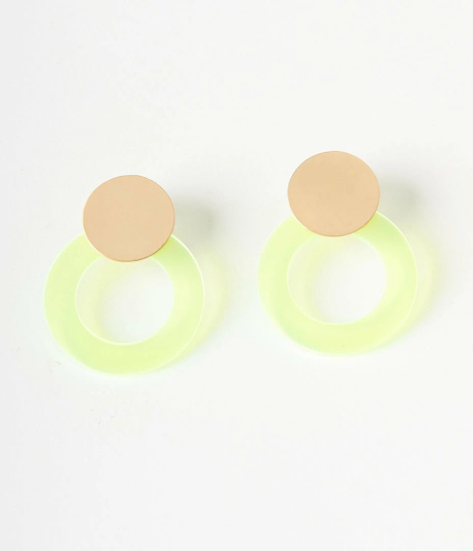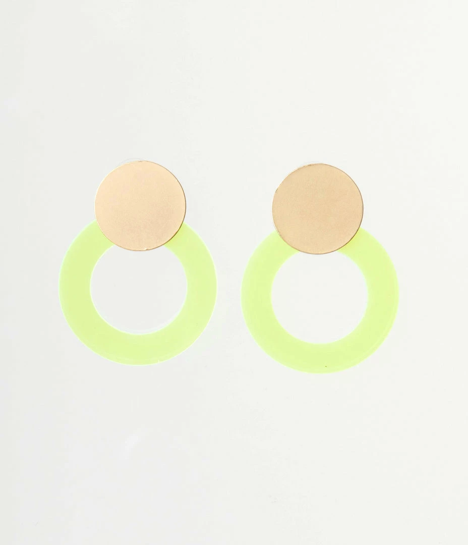 This bold pair of earrings boasts a round gold stud and a neon acrylic round drop. Complete with post backs!