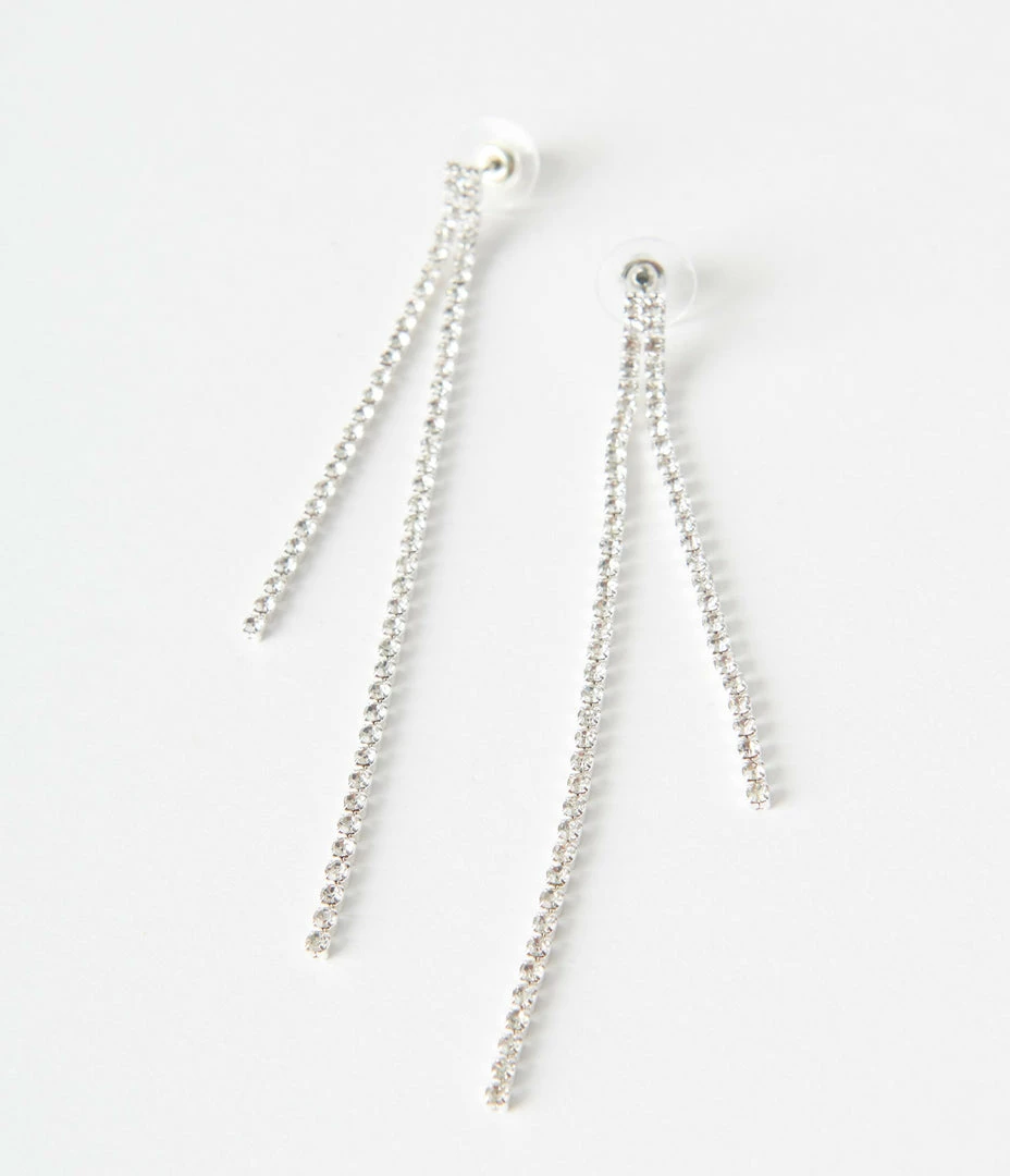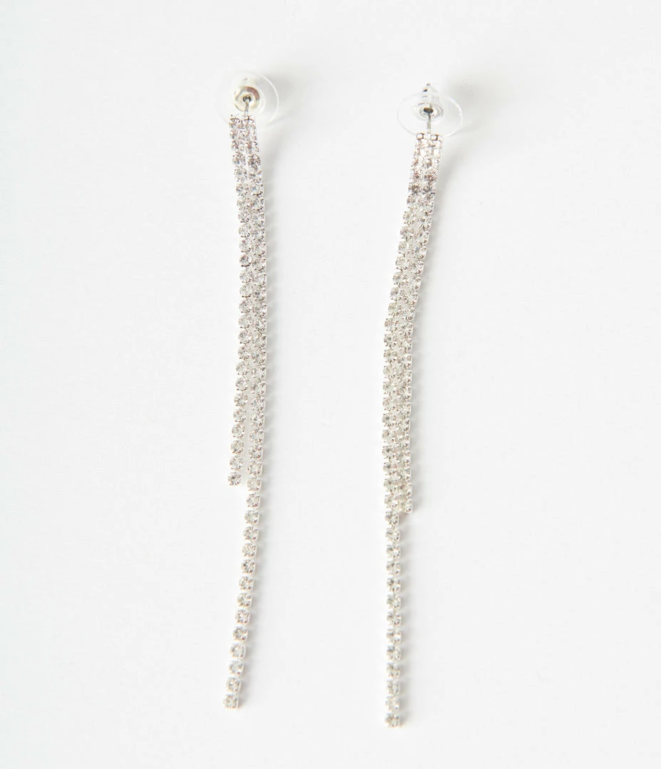 These sparkling earrings boast cascading rhinestones set in silver hardware, secured with post backs!