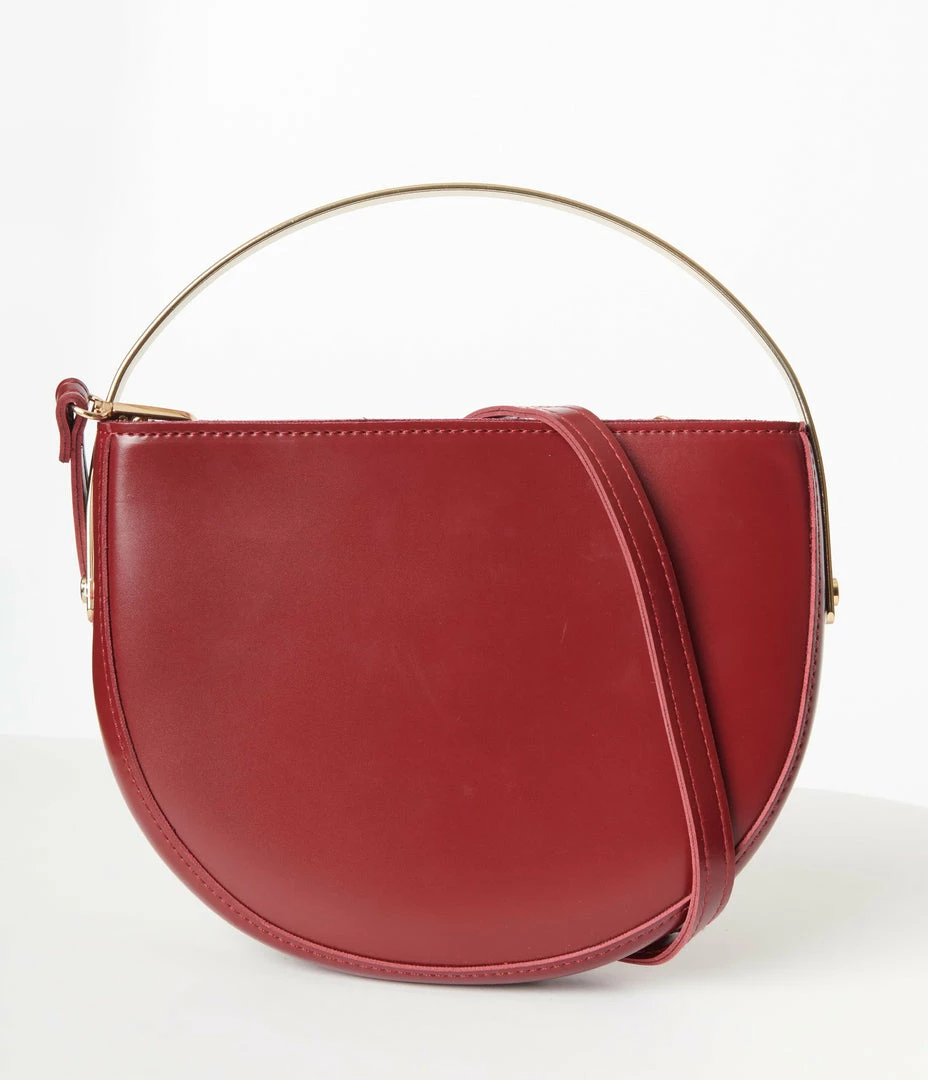 This charming handbag is crafted in wine leatherette and boasts a convertible top handle in golden hardware, and removable shoulder strap.