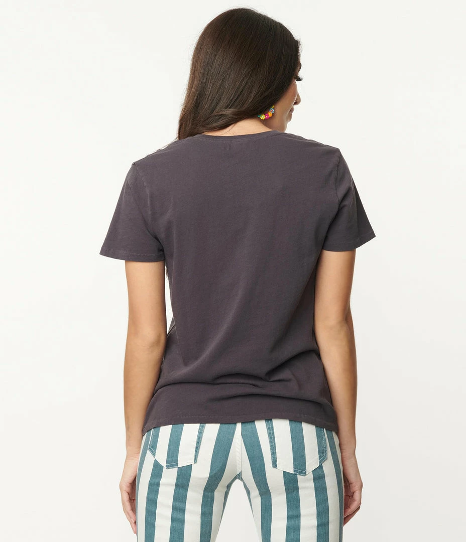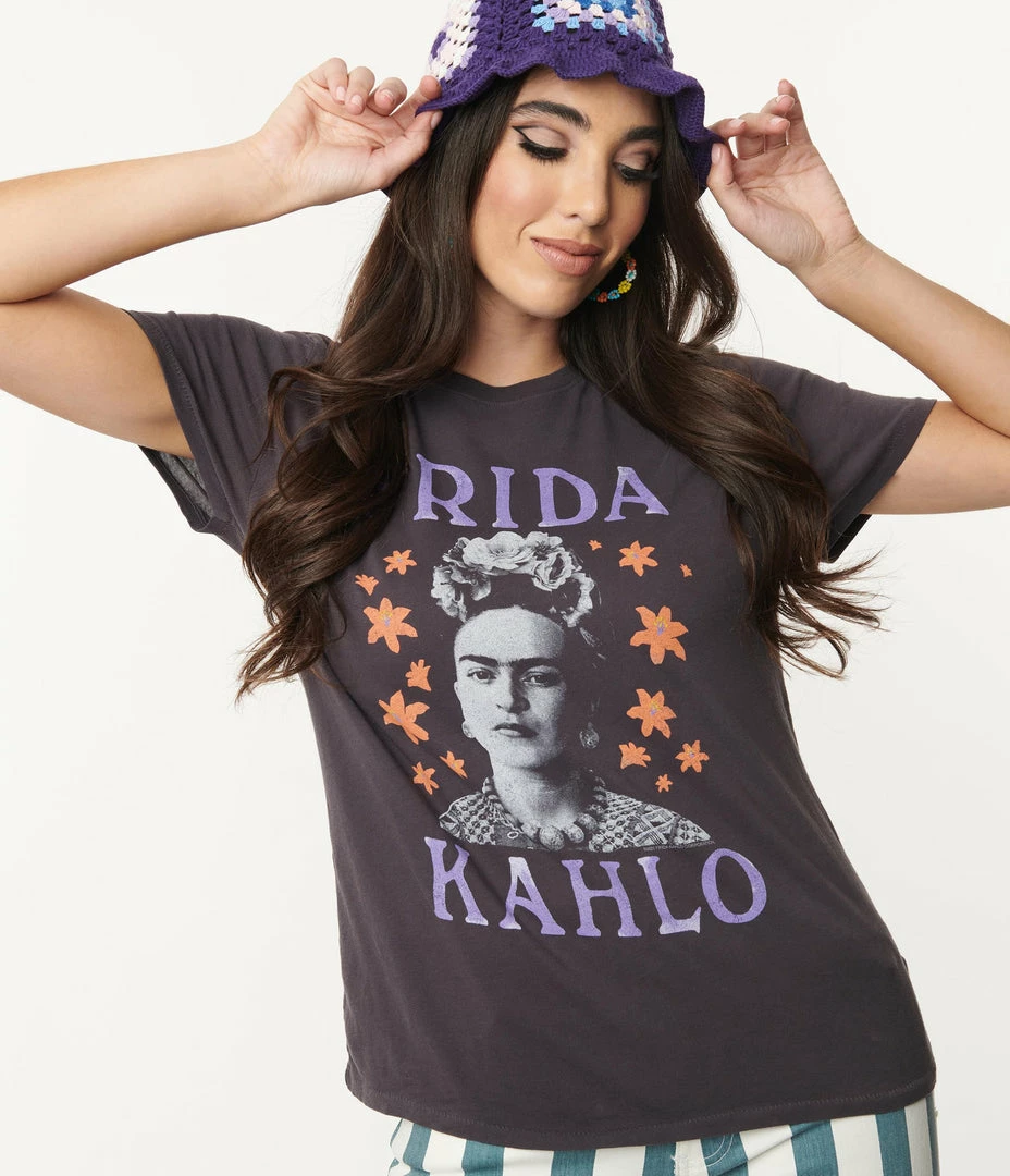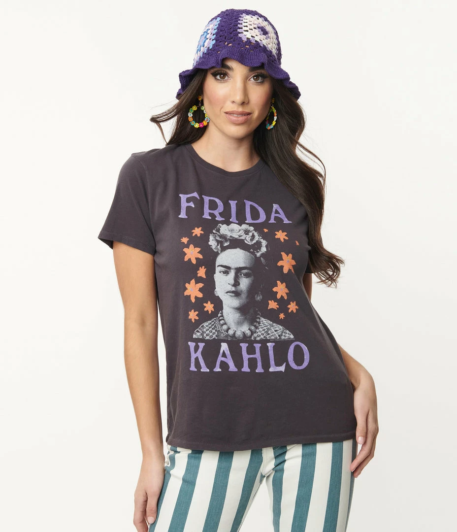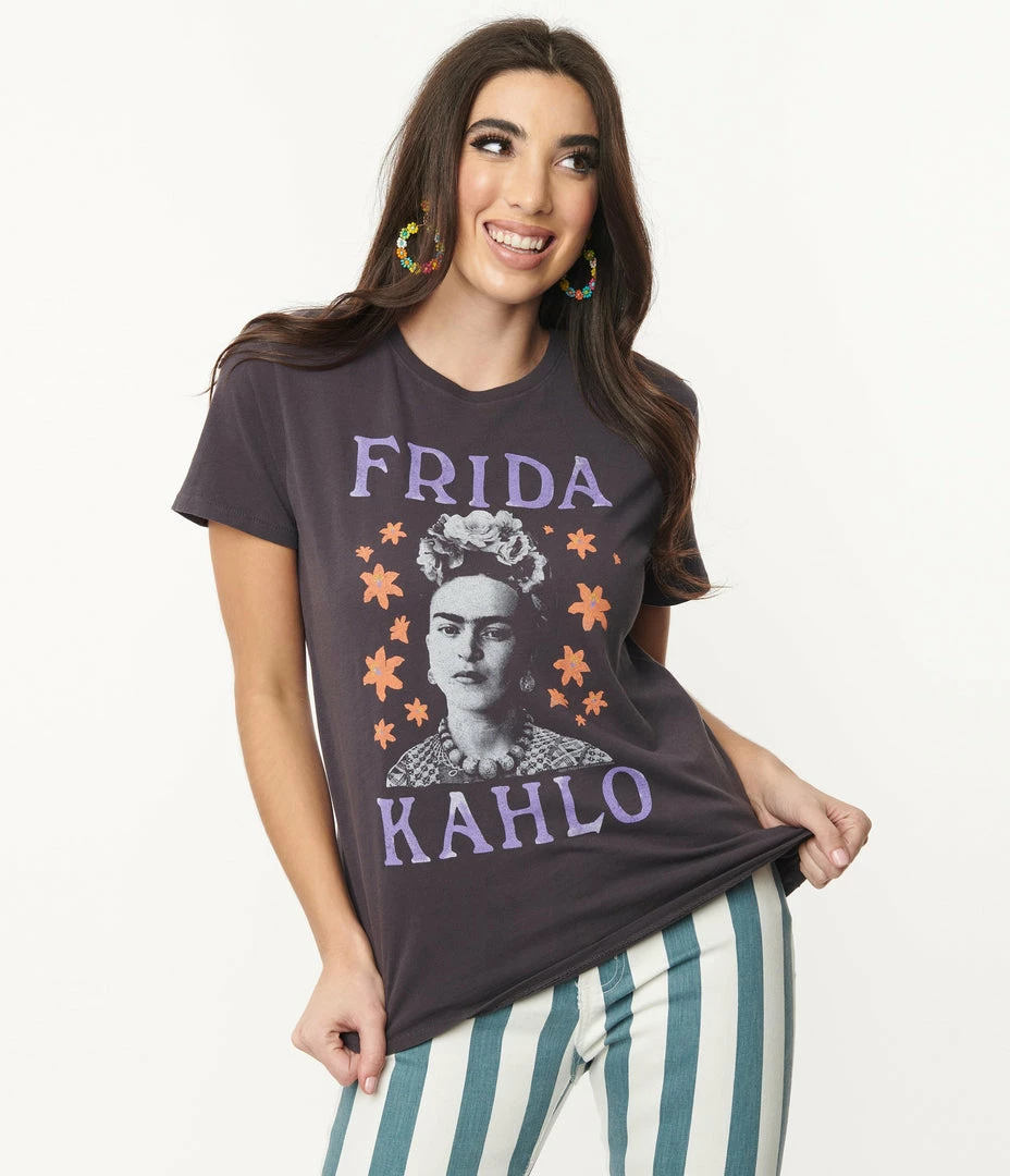 Paint flowers so they will not die, dears! Show your love for Frida Kahlo in a fabulous Junk Food vintage tee, crafted in a dark grey cotton. Featuring a screen print of Frida herself, surrounded by flowers while the crew neckline and sweet short sleeves keep it retro!