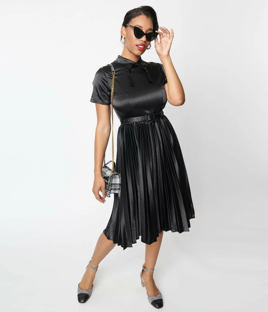This dazzling midi dress is crafted in black vegan leather and boasts a classic collar framed by short sleeves, a darling pleated midi length skirt. Complete with a matching belt!