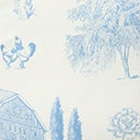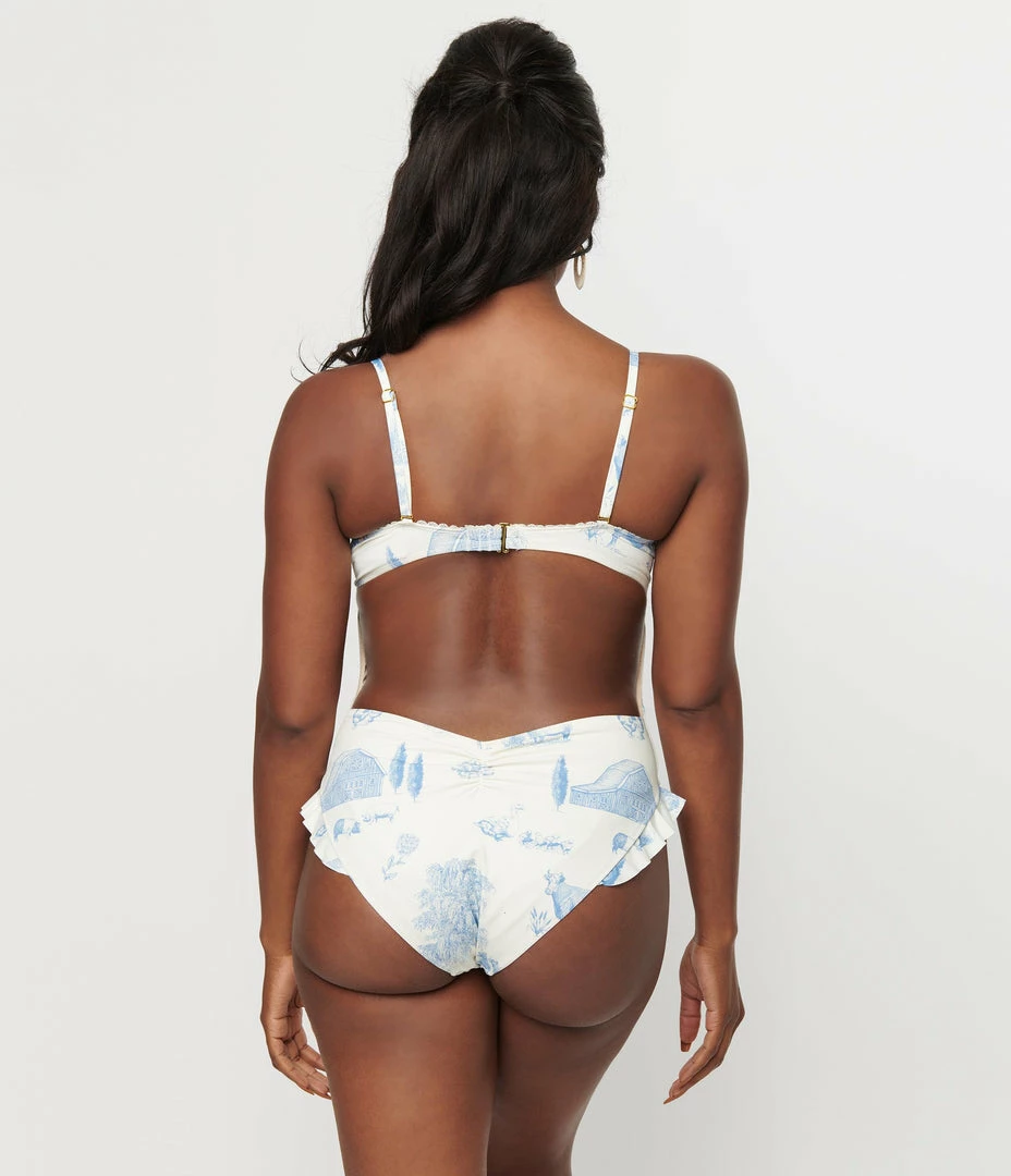 This sweet one piece swimsuit features a blue farmland themed toile print with barns, trees, roosters, ducks, pigs, and cattle throughout the ivory background. Outfitted with back hook, underwire, removable padding, adjustable straps, and mesh lining.