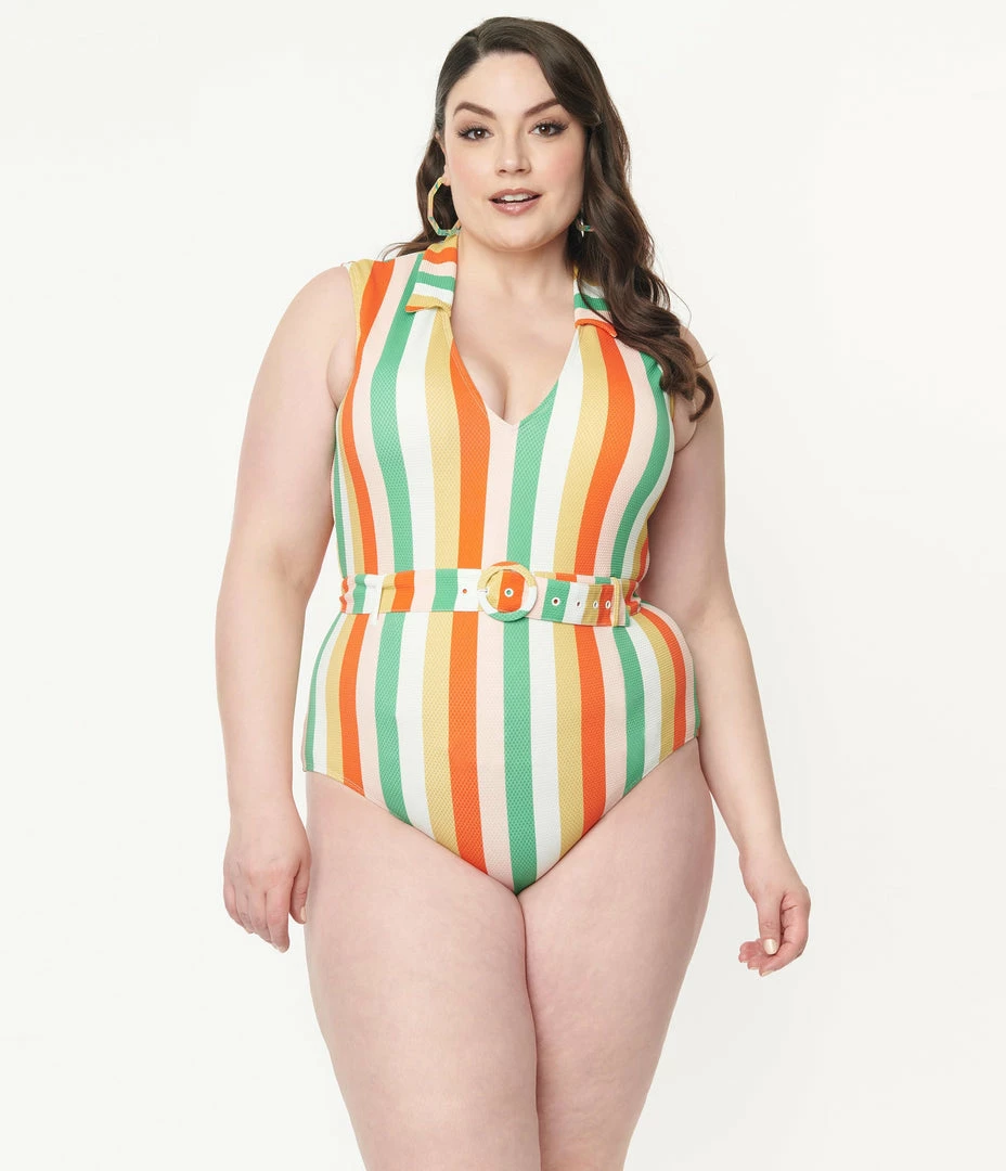 Keep it groovy, baby! Fresh from Kingdom & State, this iconic plus size one piece swimsuit is a fabulous resort ready piece full of sultry pin up vibes. A brilliant pattern of stripes highlight your sexy feminine figure in white, green, orange, and yellow while removable padding and a built in shelf provide a subtle boost. A matching belt embellishes your hourglass while this fully mesh lined bathing suit exudes stunning 1970s memories!ย