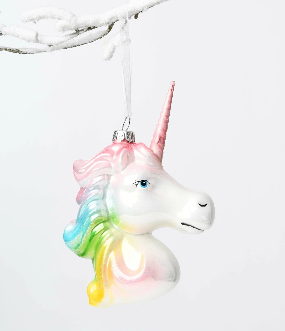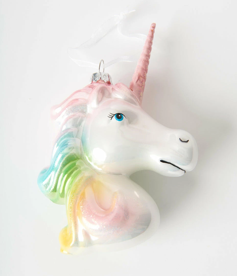 This adorable ornament is crafted in glass in the shape of a sweet unicorn head, and painted in white and pastel rainbow. Complete with ornament cap and ribbon hanger!