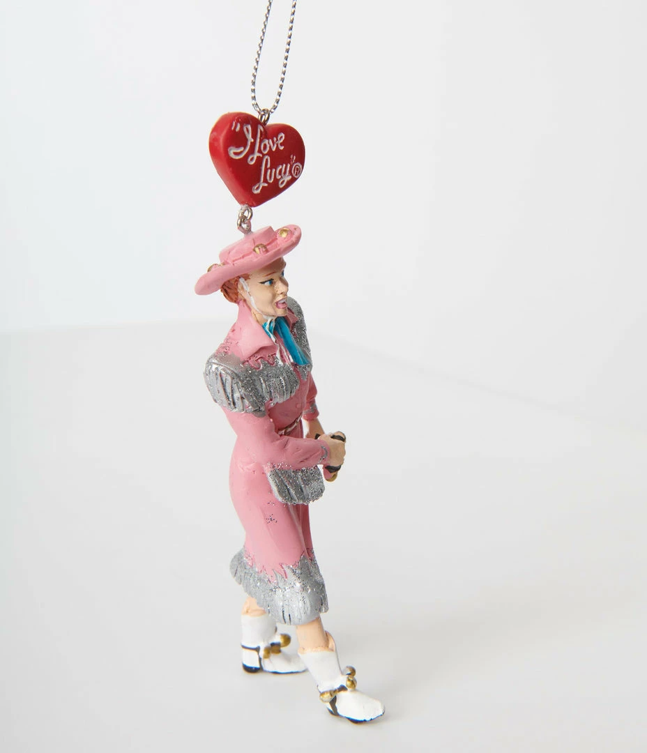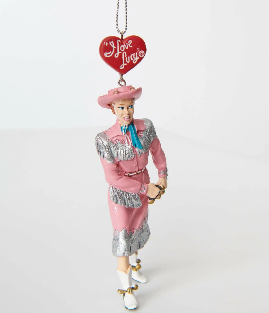 Featuring a giddy Lucy dressed as a cowgirl, this wonderfully detailed figural ornament hangs from the red heart logo from the beloved show.