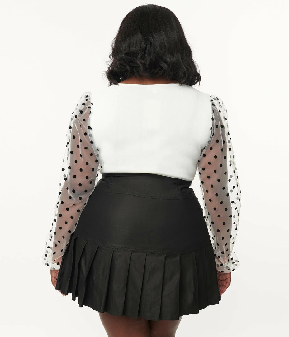 A perfect piece for vintage mavens and retro darlings, this sultry plus size white top is crafted in a textured knit that boasts sheer long sleeves, embellished with black Swiss dots and nipped with elastic cuffs. The classic square neckline leaves room for your favorite necklace!