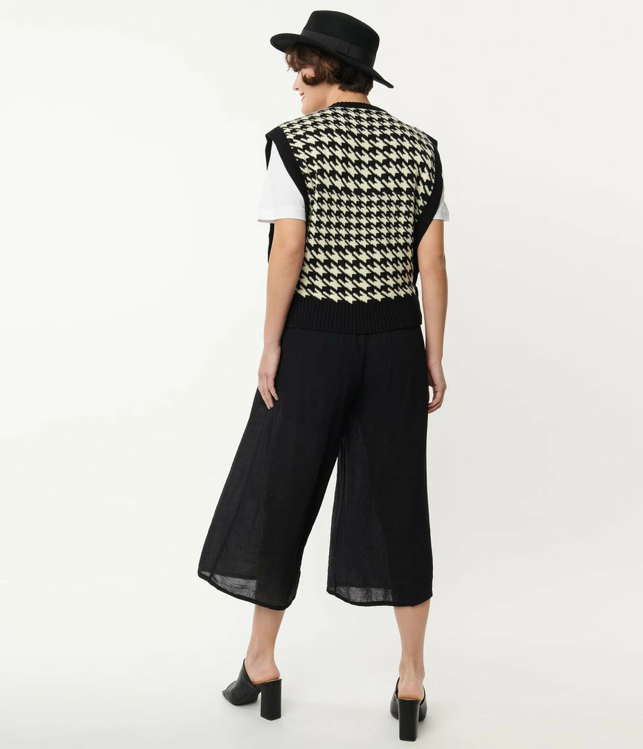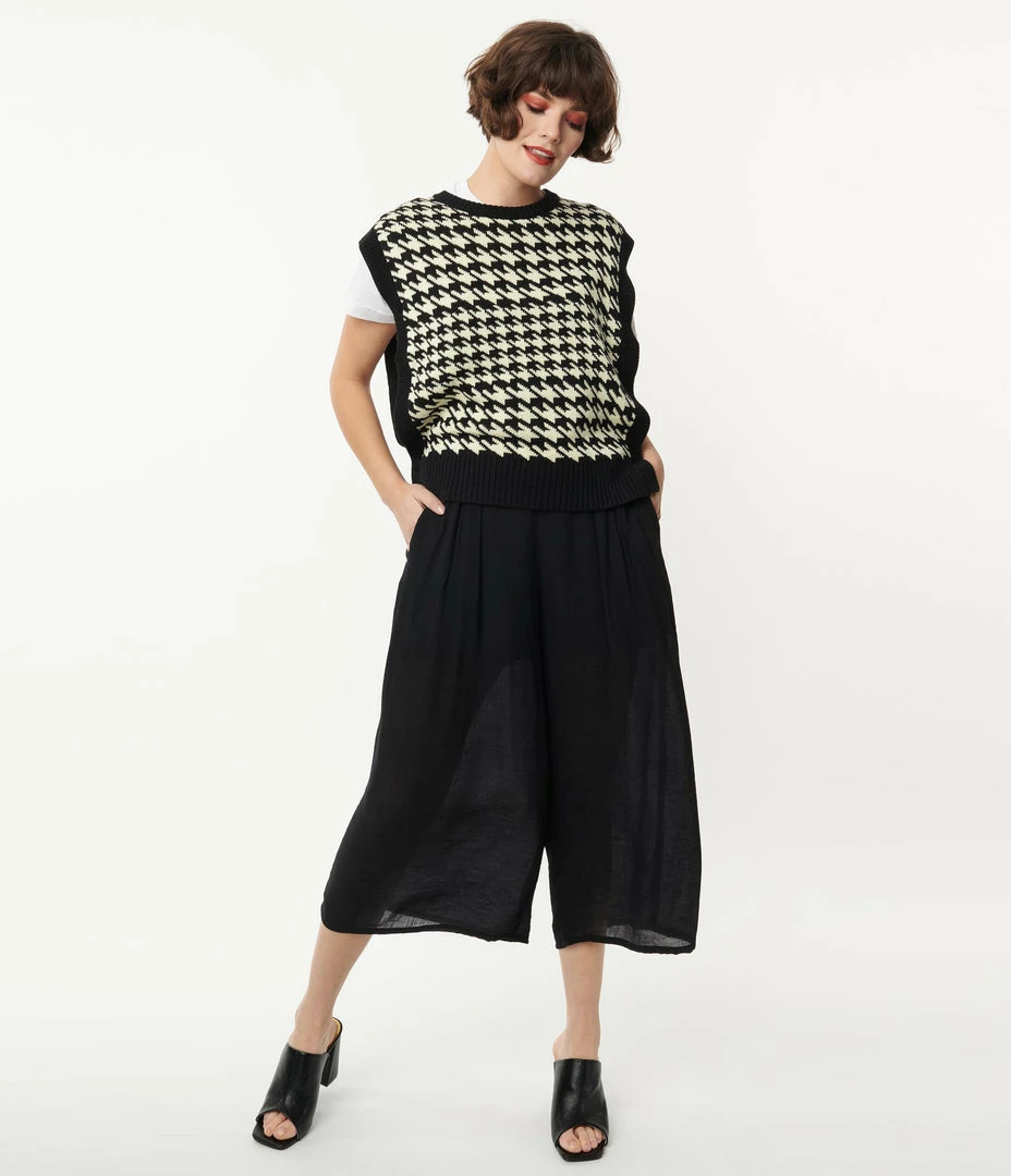 Your poses are on point, darling! A feminine, retro inspired separate in a black lightweight woven crepe. These culotte boast a banded high waist is cinched with back elastic, while the fabulous wide legs are topped with pleated accents for retro flair. Complete with side pockets for a modern touch!