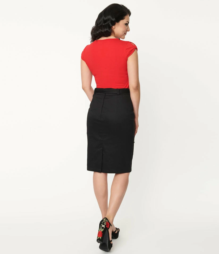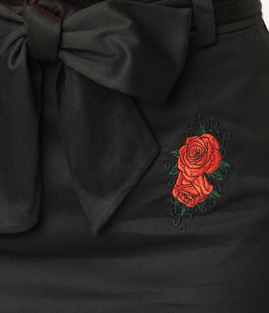 A sultry pencil skirt crafted in black cotton with a dash of stretch. Embroidered red Spanish roses embellish the front, complete with a back zipper and matching sash.