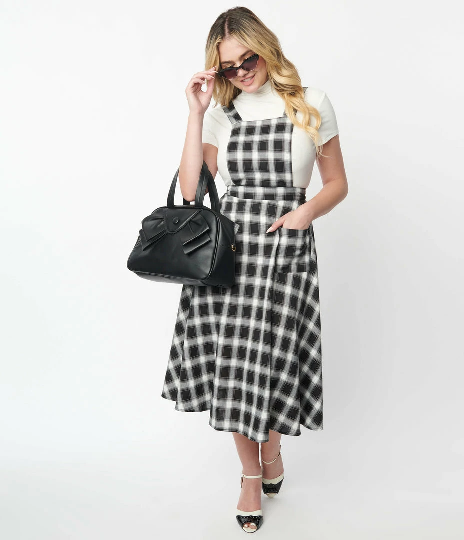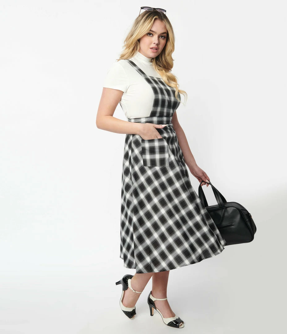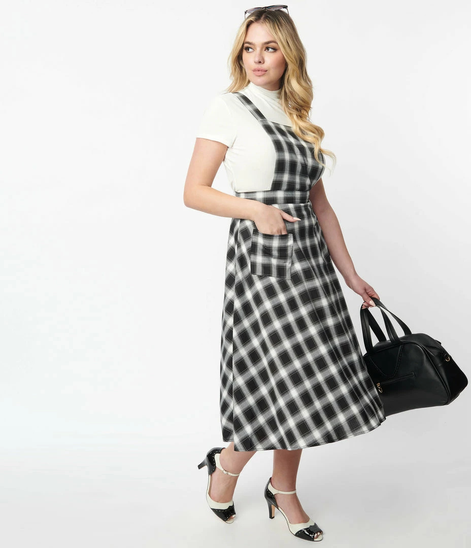 This vintage inspired pinafore skirt is crafted in a lightweight woven fabric that features a black and white plaid pattern throughout. Outfitted with adjustable straps, a back zipper, and front pockets.