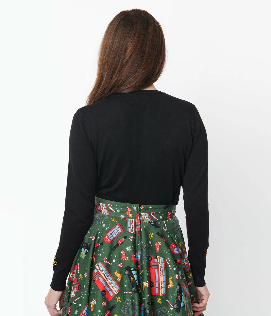 This adorable cardigan is crafted in a black soft knit and boasts London holiday embroidery featuring snowflakes, crowns, peppermints, a cab topped with a Christmas tree, and a double decker bus. Complete with button front and cozy long sleeves!