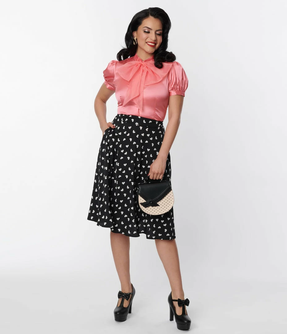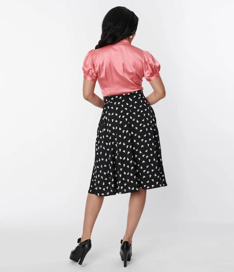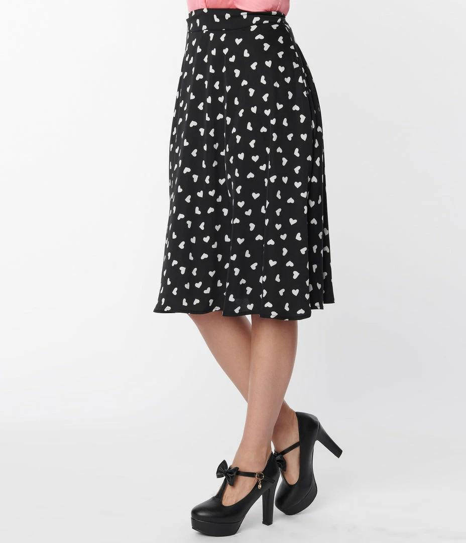 This sweet 1950s inspired swing skirt is crafted in a black lightweight knit that dances with white hearts throughout. Complete with back zipper and side pockets!