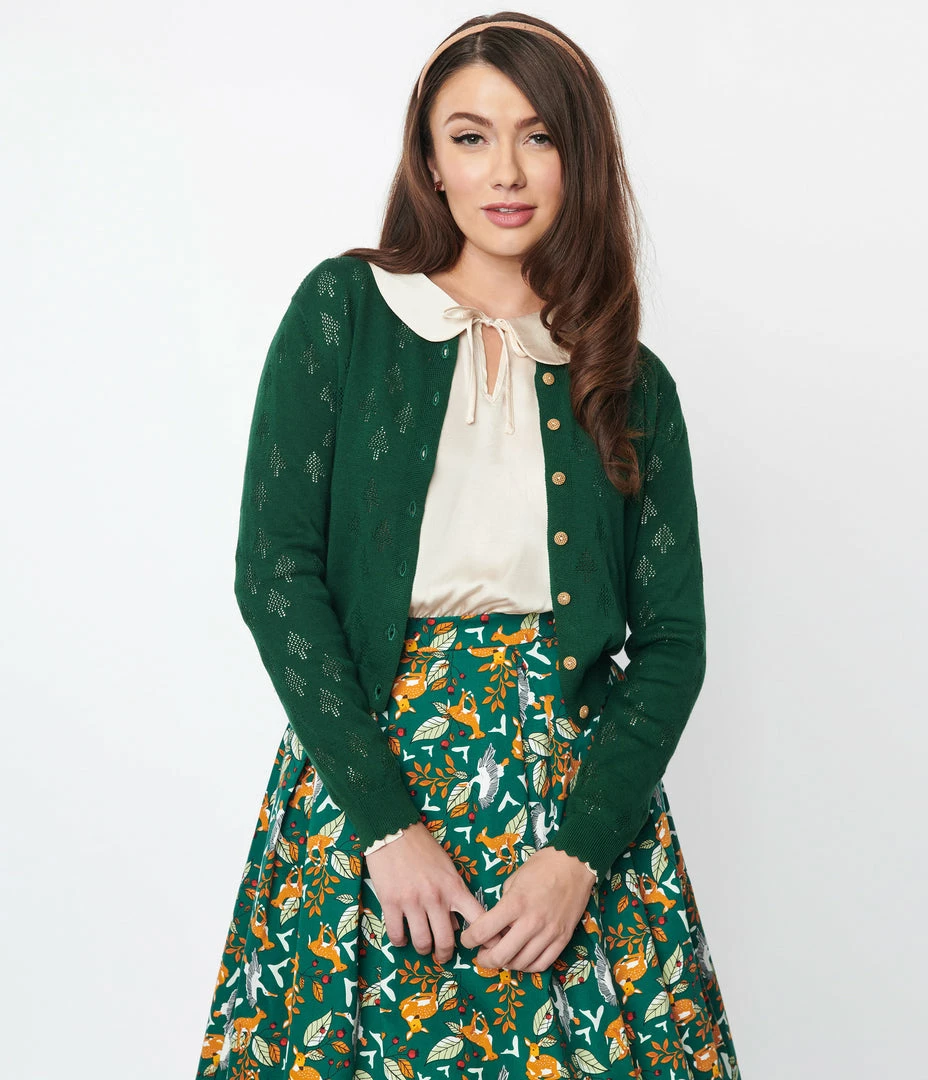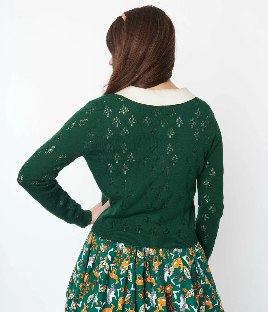 This darling cardigan is crafted in a soft knit with perforated knit Christmas trees throughout. Complete with a button front, scoop neck, and slender long sleeves.