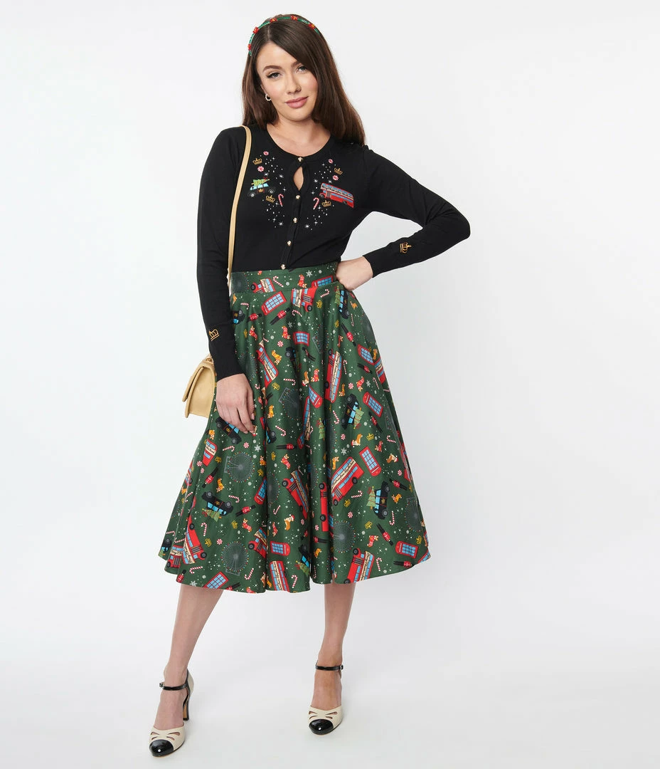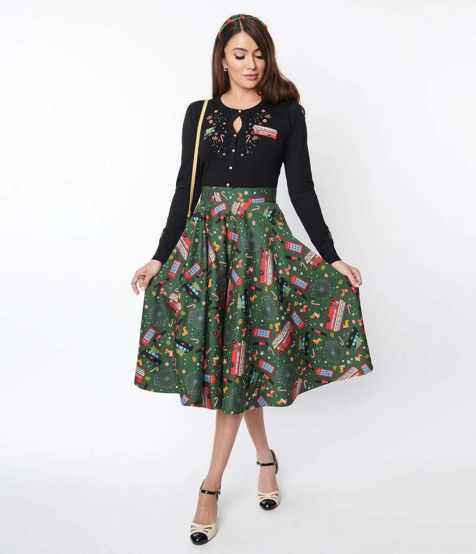 This sweet swing skirt is crafted in cotton and boasts a London town holiday print with snowflakes, crowns, double decker buses, peppermints, and cabs topped with Christmas trees throughout the green backdrop. Complete with back zipper and side pockets!
