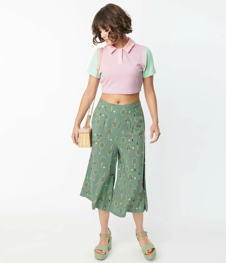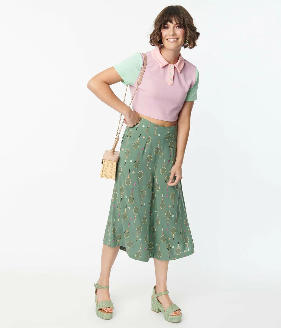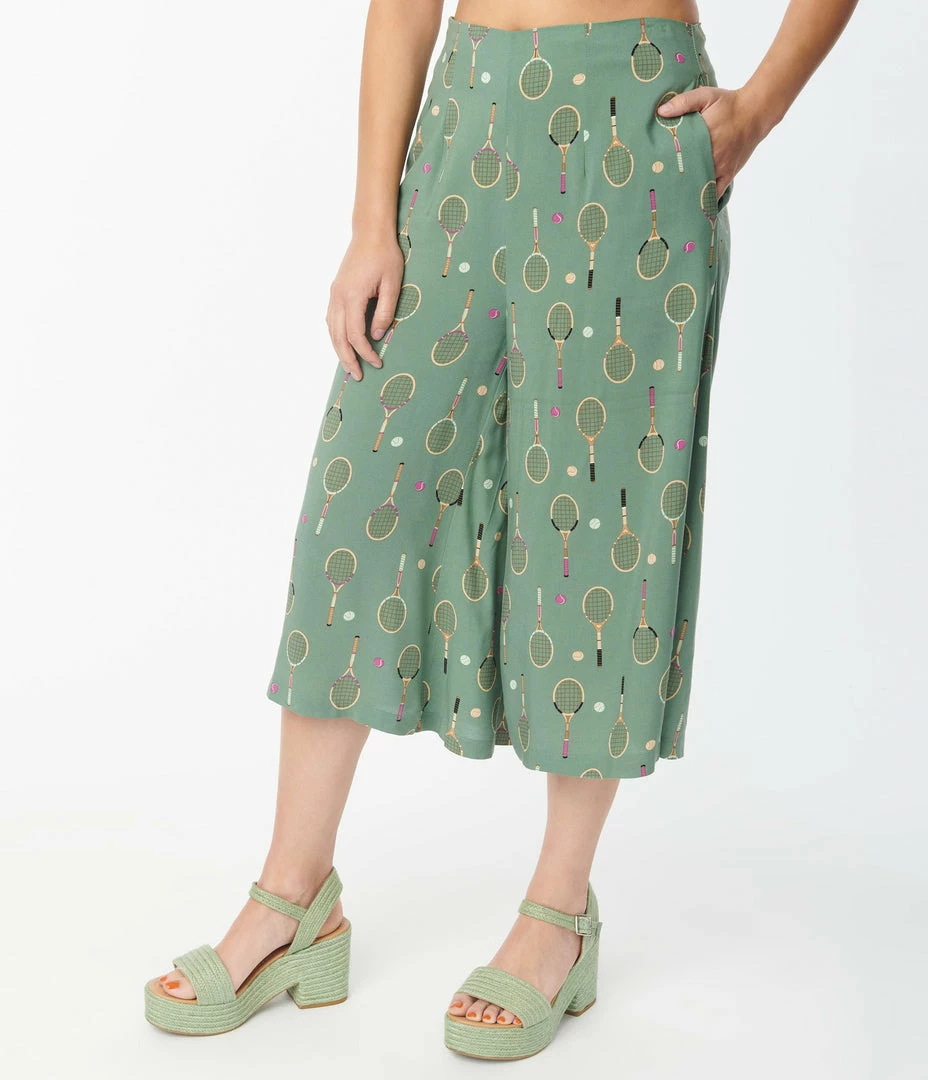 These retro inspired culottes are crafted in a soft woven fabric and boast tennis rackets and tennis balls throughout the green backdrop. Complete with back zipper and side pockets!