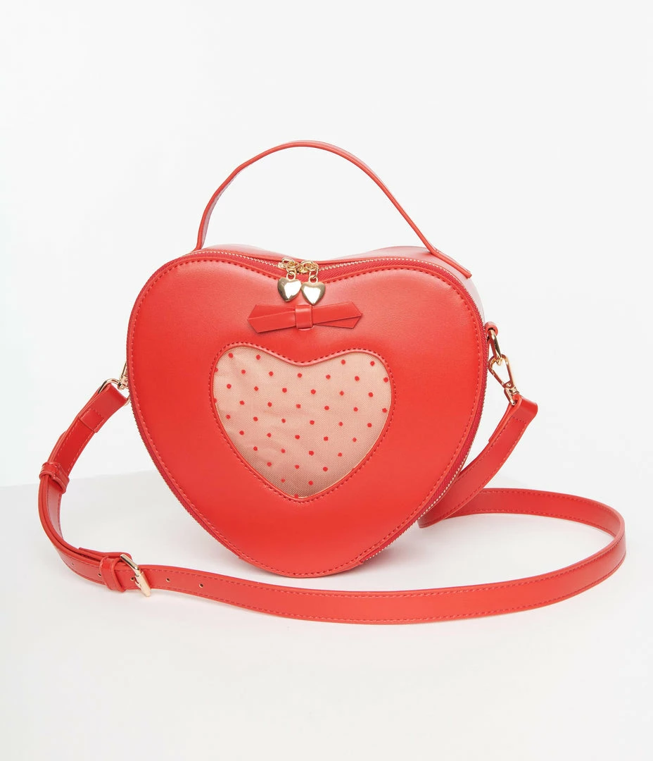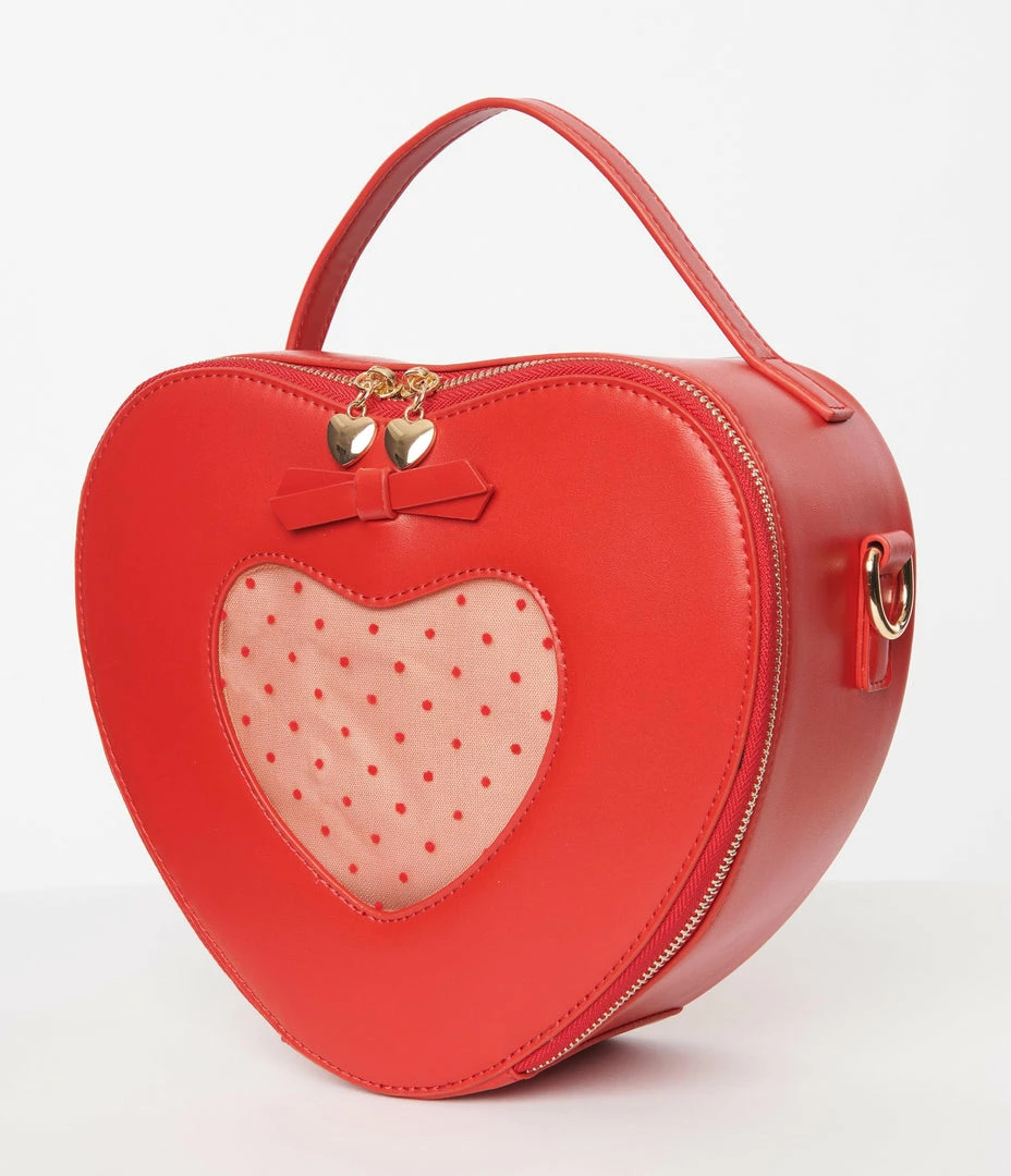 Cupid’s arrow has struck once you set your eyes on this beautiful handbag! Crafted in a red faux-leather, this crossbody handbag will have your heart singing with its adorable heart shape and gold lining. Boasting a mesh dot window with dual zipper closure, this darling purse features an external zip pocket and a top handle that allows this vintage-inspired purse to be converted into a handbag by removing the adjustable crossbody strap.