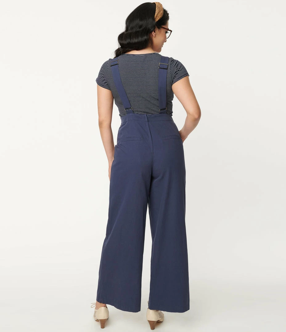 These chic overalls are crafted in a navy blue woven blend and is outfitted with adjustable straps, a back zipper, faux buttons, and functional side pockets.