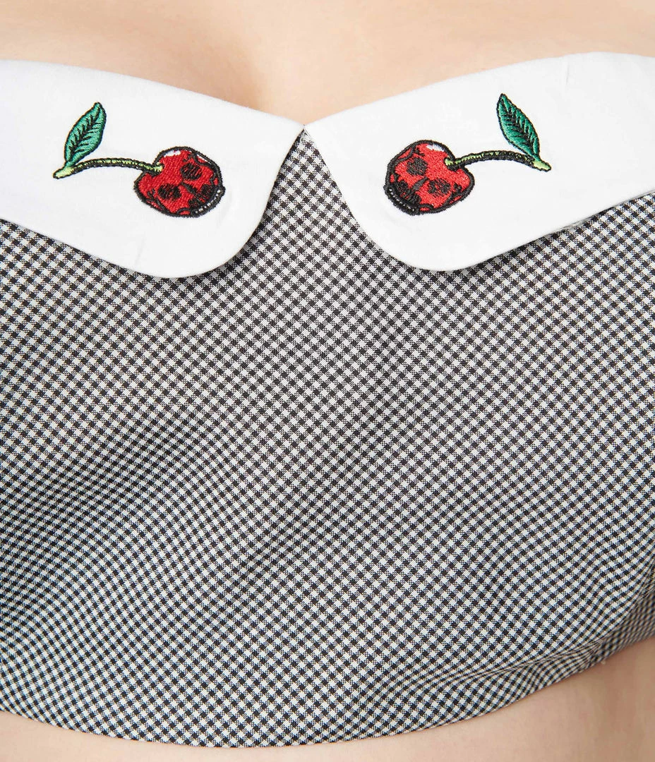 A sultry plus size crop top crafted in a lightweight woven crepe that boasts a black and white gingham pattern. The solid white fold over features embroidered cherries with skull motifs, complete with a smocked back and back self ties.