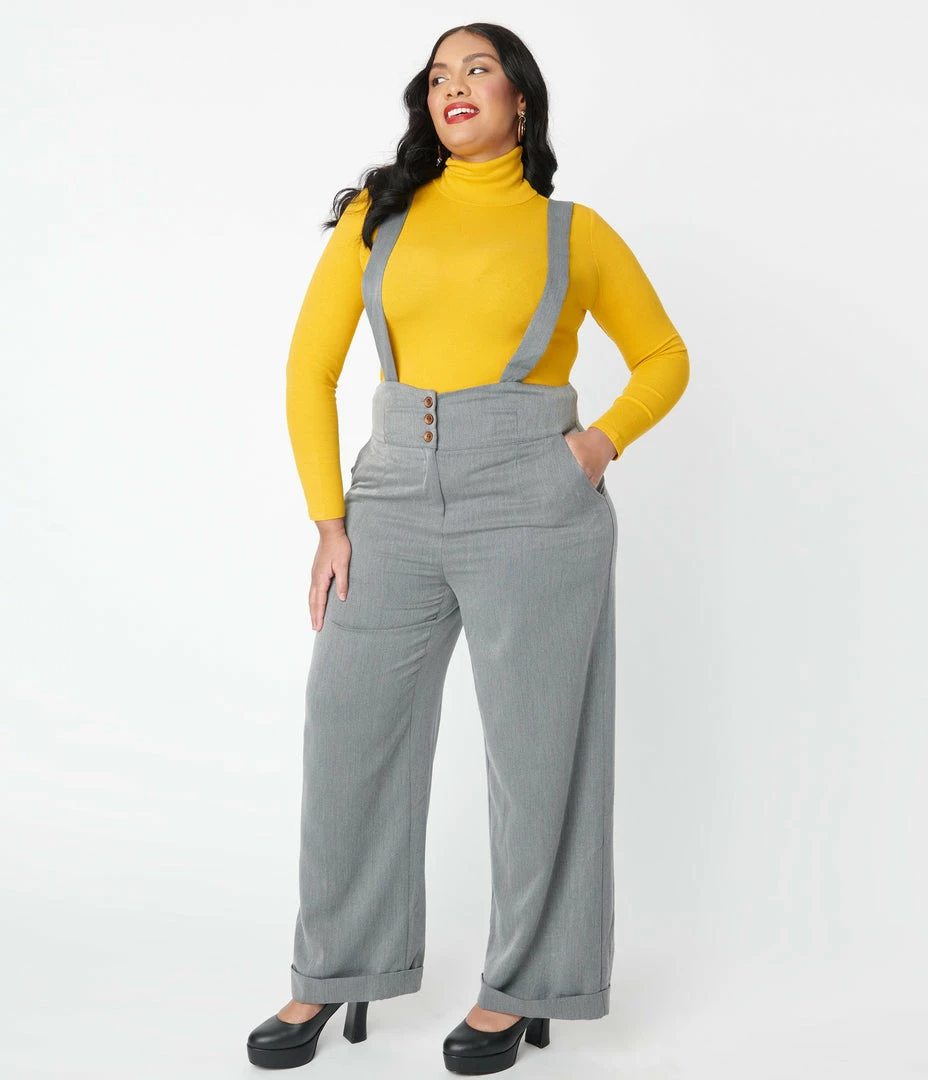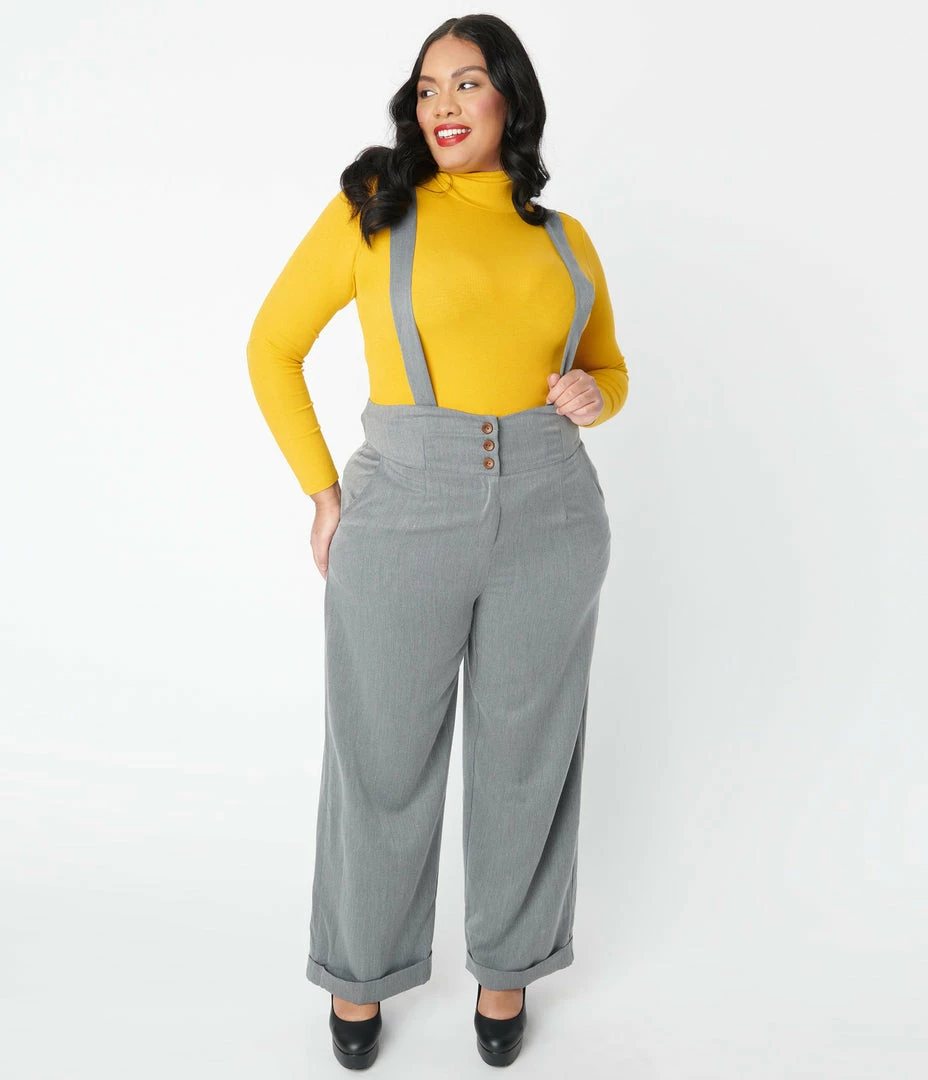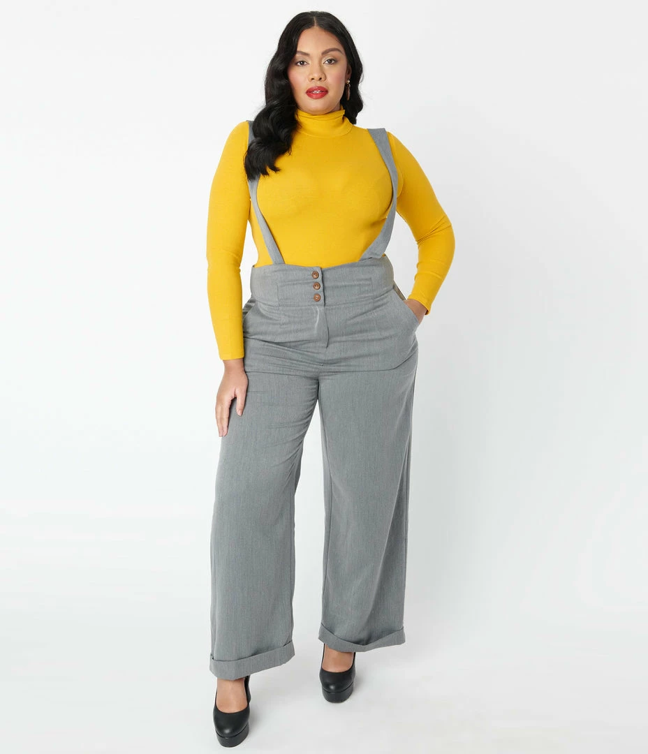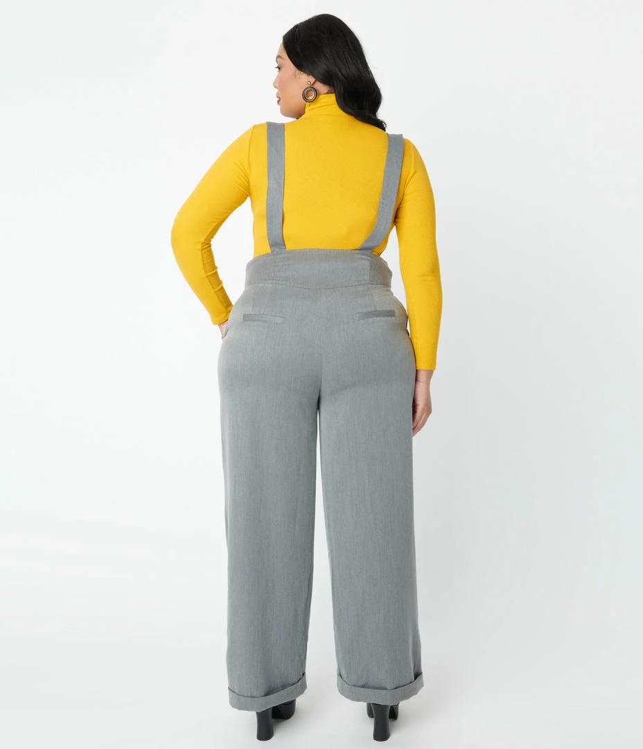 For audacious adventures, dames! A fabulous retro staple in a beautiful grey, these sensational plus size suspender pants are crafted in a lightweight woven fabric for a breezy addition to your ensemble. The high banded waist is cinched with a front zipper and three buttons while the classic suspenders are secured with buttons and can be easily adjusted for a flattering fit. The sweeping wide legs drop into a faux rolled cuffs and are outfitted with side pockets for modern function!