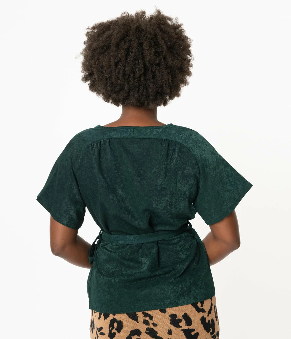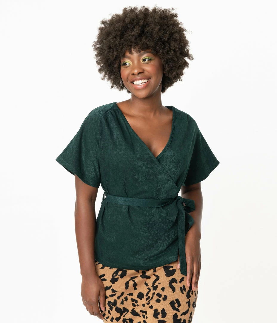 Eternally versatile! A fabulous and easy essential for instant retro delight, this full wrap top is crafted in a fabulous crushed woven emerald green fabric. The sultry surplice neckline is cinched with a matching sash while belt loops keep this sweet piece secure. Outfitted with short sleeves and featuring a longer torso!