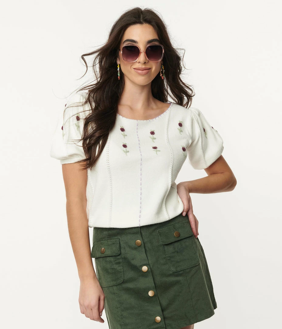 Cozy up in style, dolls! This sweet and soft sweater is crafted in an ivory knit. The scoop neckline is accented with a light purple embroidery that is centered down the bodice framed by eggplant and green floral embroidery. Complete with charming puff short sleeves and a stay-in-place hem tucks perfectly into your favorite separates
