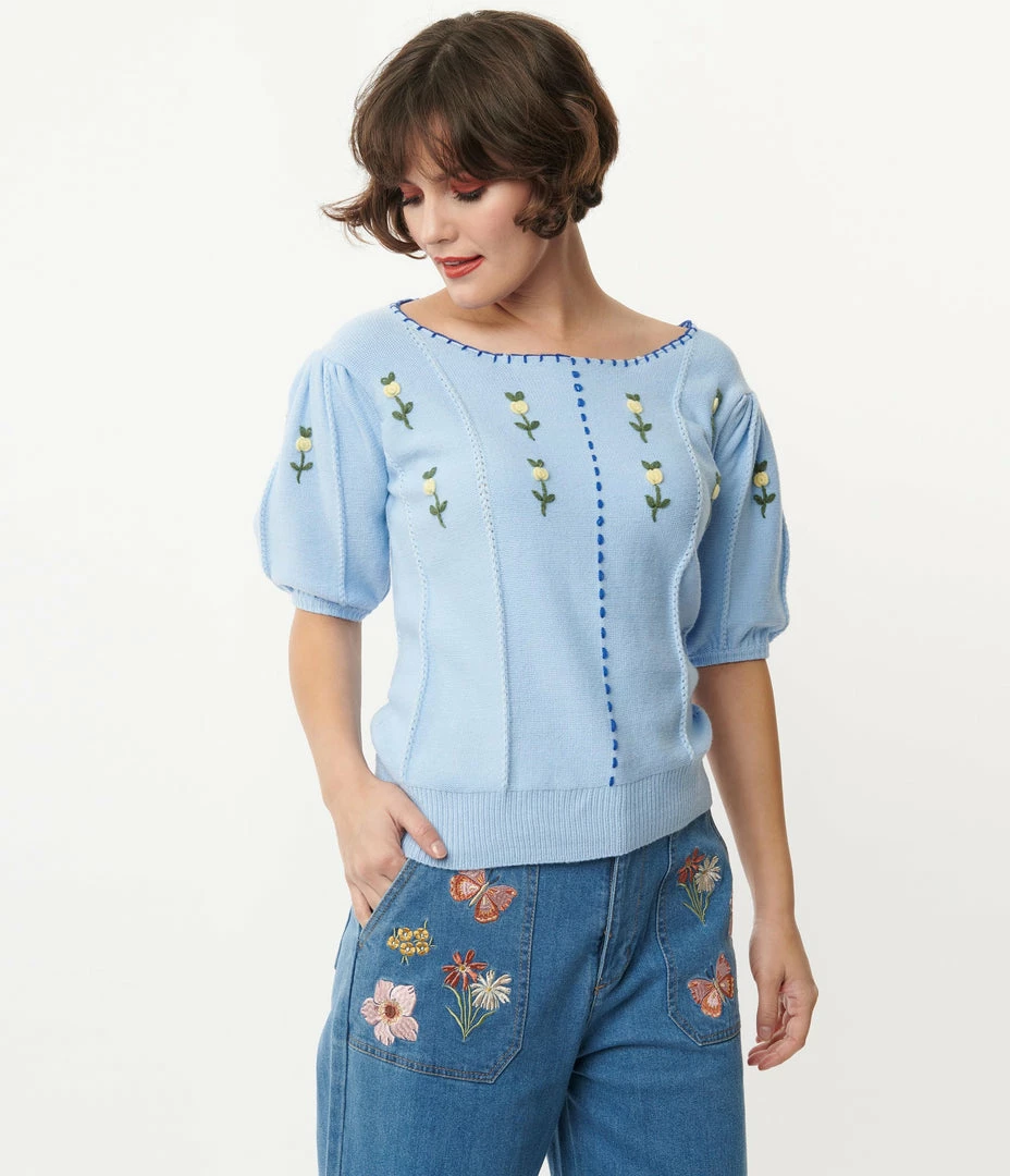 Cozy up in style, dolls! This sweet and soft sweater is crafted in a light blue knit. The scoop neckline is accented with a blue embroidery that is centered down the bodice framed by white and green floral embroidery. Complete with charming puff short sleeves and a stay-in-place hem tucks perfectly into your favorite separates