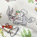 A flirtatious crop top in collaboration with Looney Tunes, crafted in a satin-like fabric that features the stars of Looney Tunes throughout an ivory backdrop and topped by an orange star pattern yoke. Complete in a wrap design, secured with attached ties and outfitted with short sleeves.