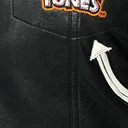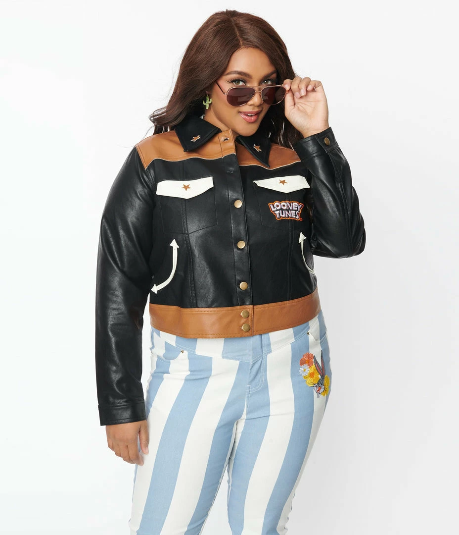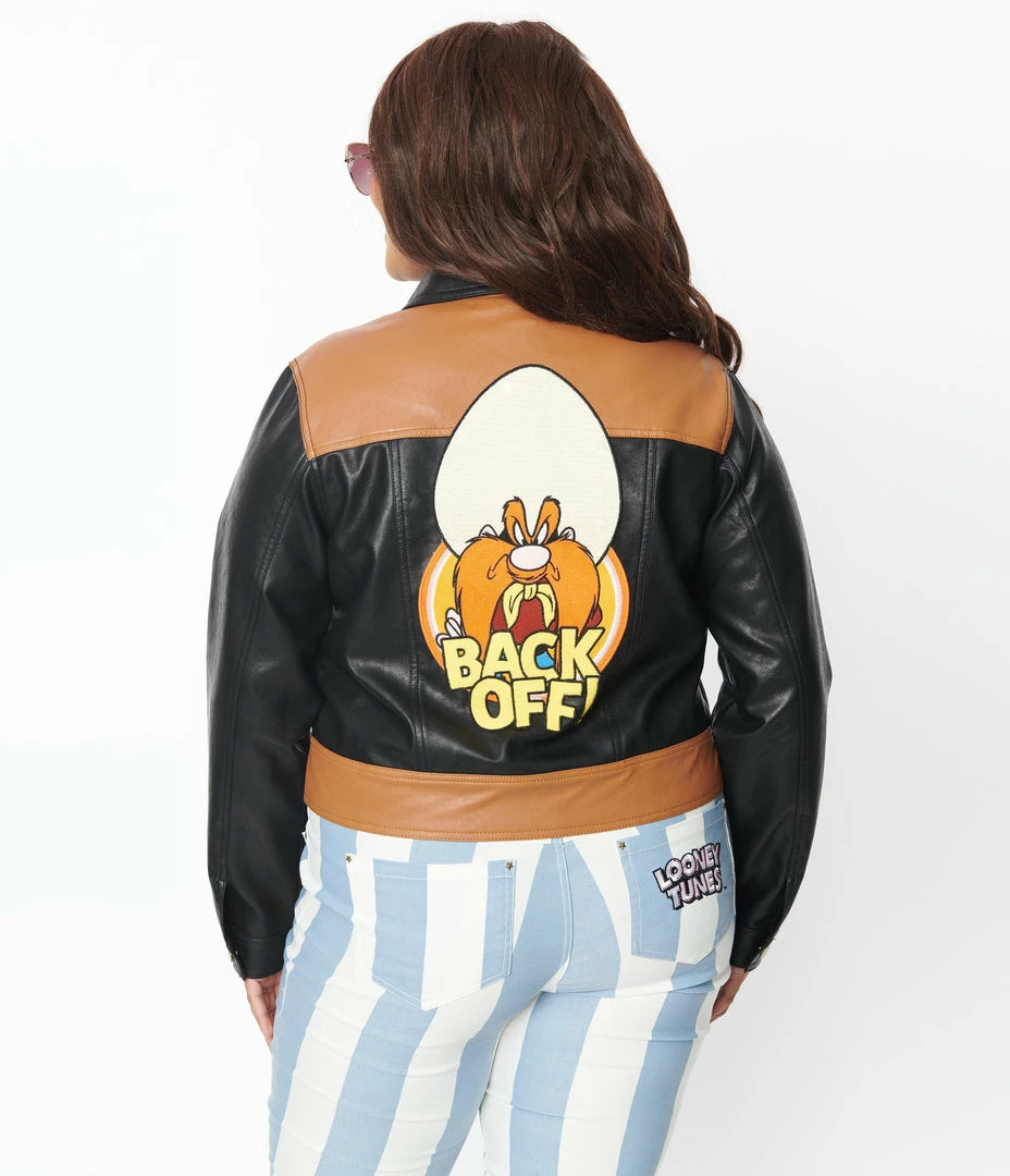 A classic plus size trucker jacket in collaboration with Looney Tunes is crafted in black and brown vegan leather and boasts a large Yosemite Sam patch on the back with the words, βBack Off!β. Complete with side and chest pockets, button cuffs, and a button up front.