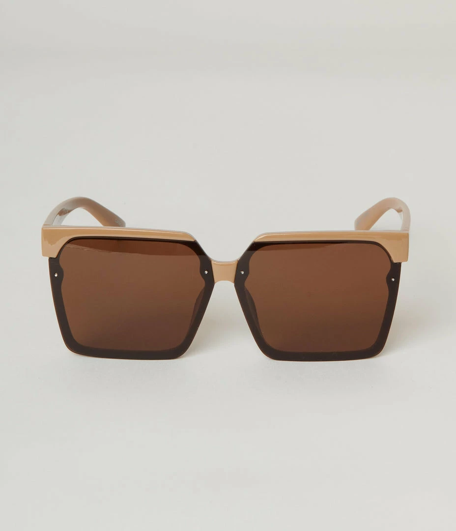 A sharp pair of sunglasses crafted in tan square frames and boasting brown tinted lenses. Complete with curved arms and molded nose.