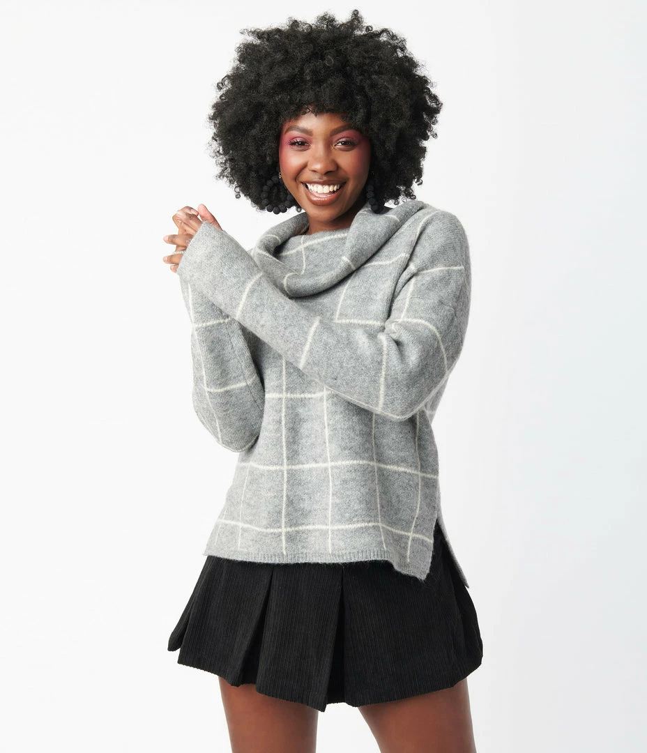 Discount โญ LUMIERE Heather Grey Windowpane Cowl Neck Sweater Sale ๐งจ