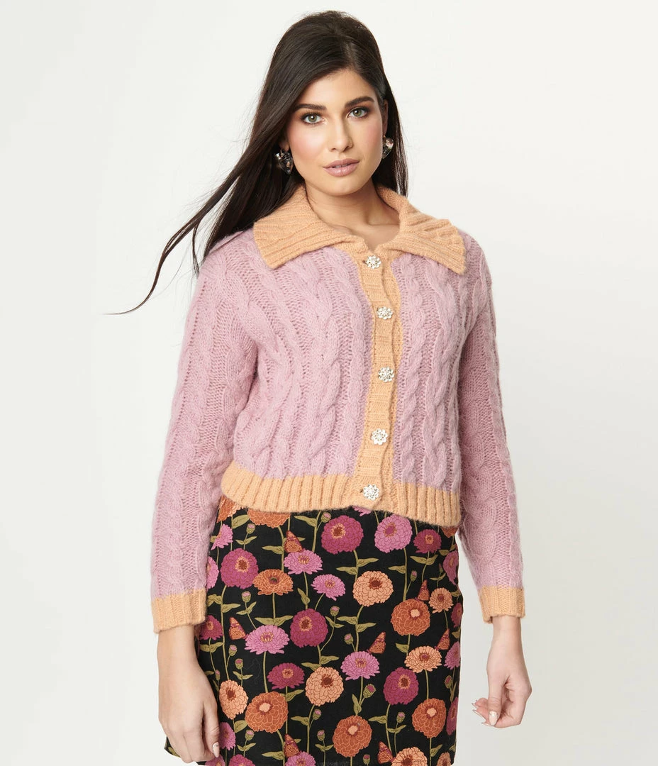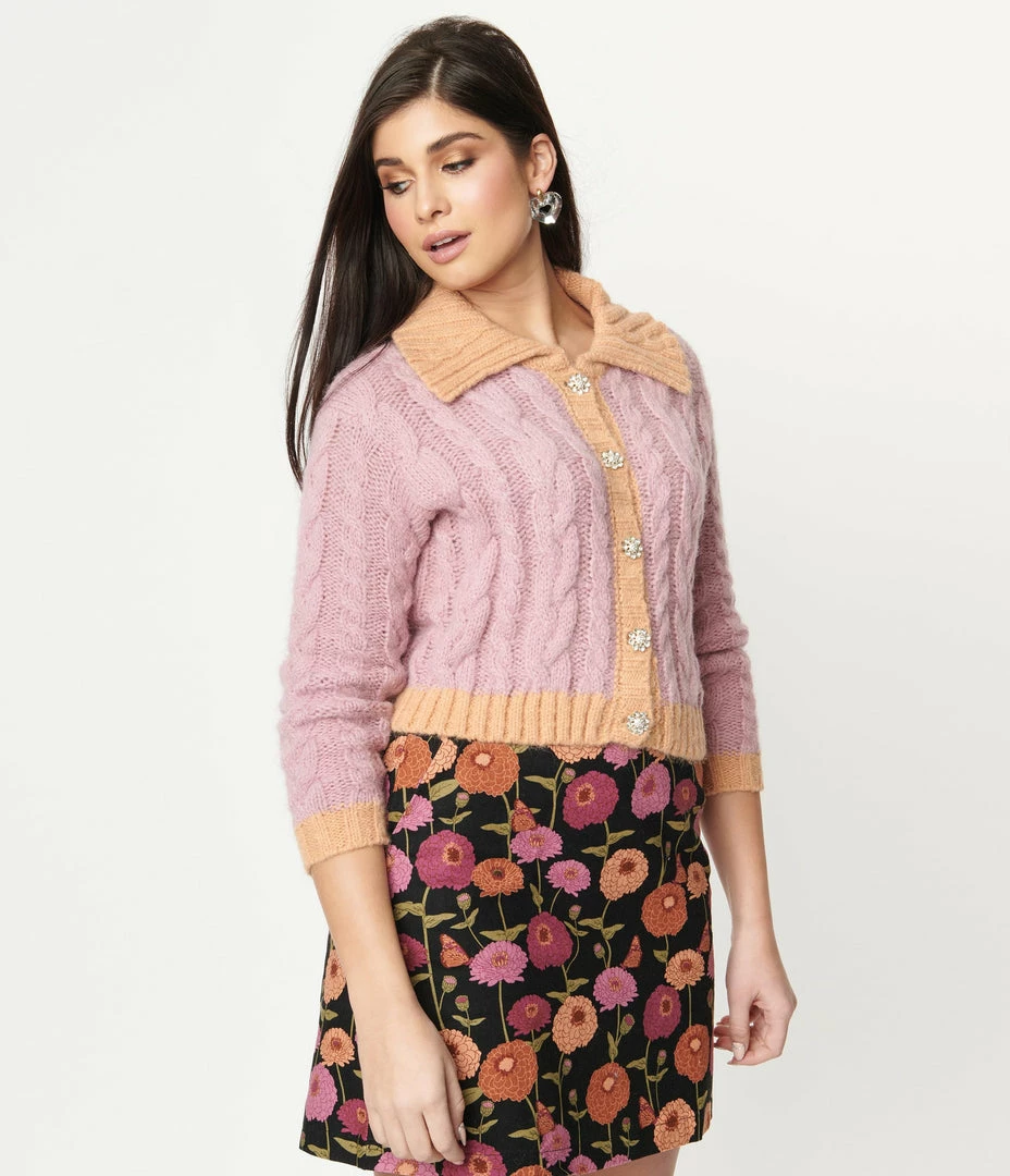 Stay cozy, dolls! A charming separate, this knit cardigan is full of retro styling, crafted in a soft knit blend the lilac bodice boasts a cable knit pattern throughout. The button up front leads to the classic collar both featuring a contrasting peach rib knit, along with the abbreviated hemline and cuffs! Available in sizes S-L while supplies last.