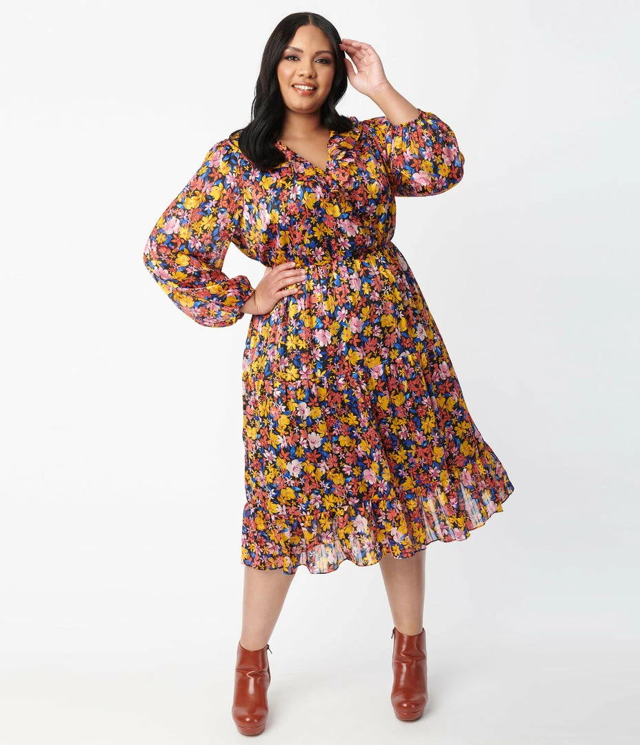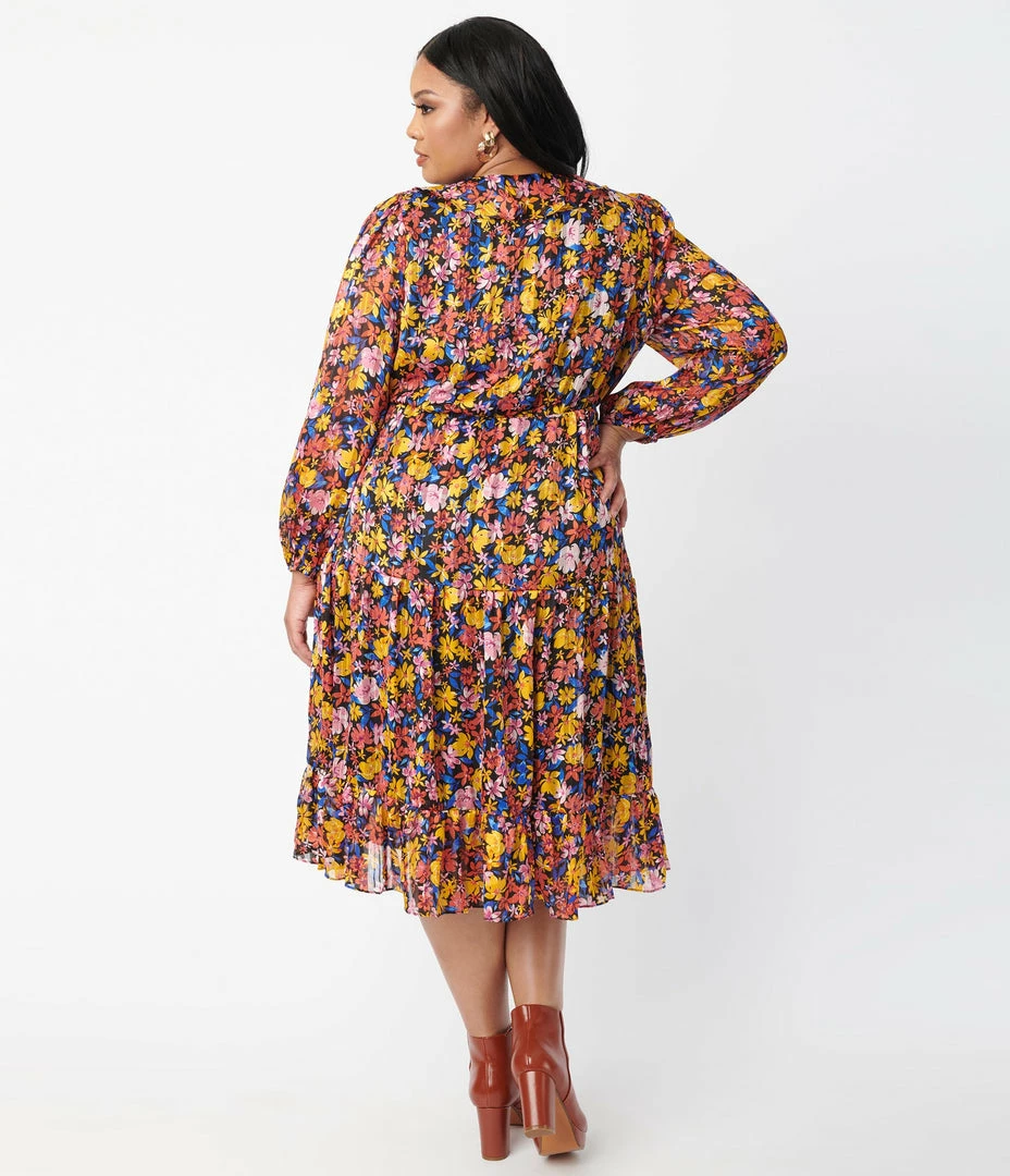 Revel in an efflorescent scene, dolls! This darling plus size midi dress is crafted in a lightweight crepe that dances with yellow, red, blue, and pink florals and sparkles with dainty accents of metallic threading throughout. The sultry surplice neckline is accented with ruffles and framed by billowing long sleeves that drop into elastic cuffs. The elastic waist nips in your figure while the sweet midi skirt cascades in a tiered design that sweeps past your knees!