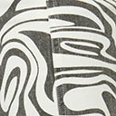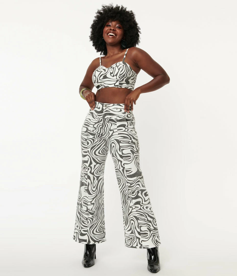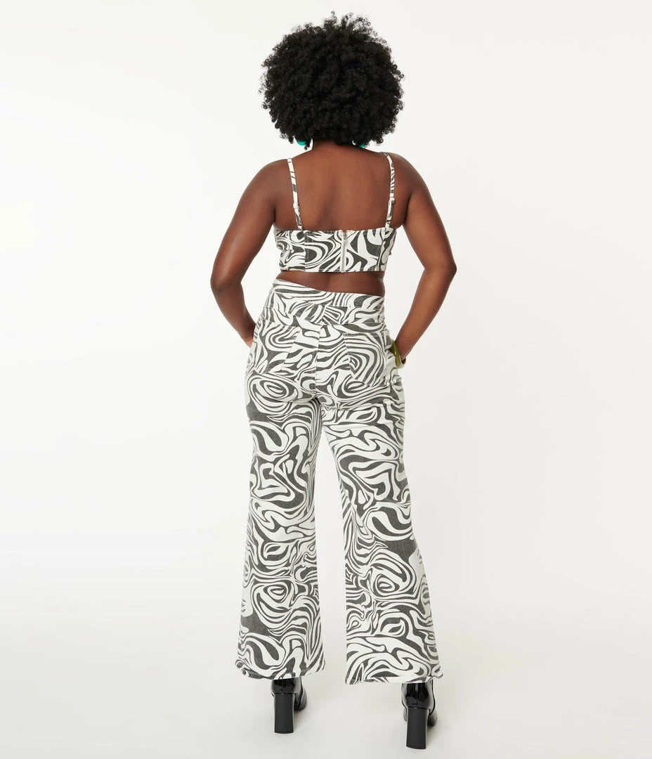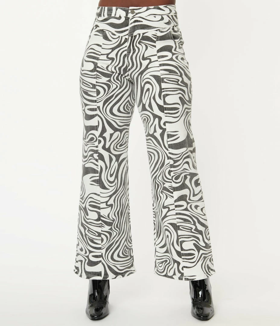Pull an attitude, gals! Bring some eye-catching edge to your silhouette with these cotton stretch denim pants, dazzling with a faded black and white swirl pattern throughout. The banded waist is cinched with a front zipper and button while side and back pockets lend function. Complete with a wide leg for added retro flair!
