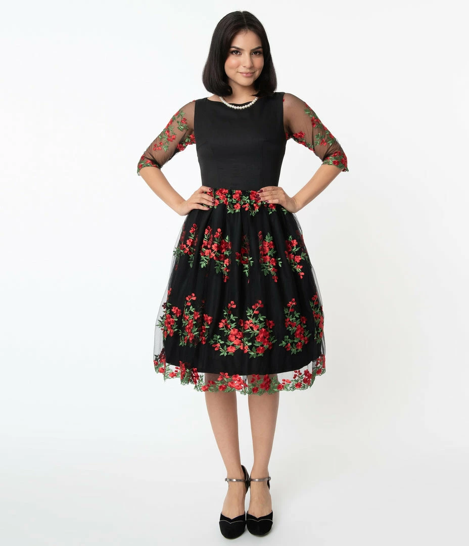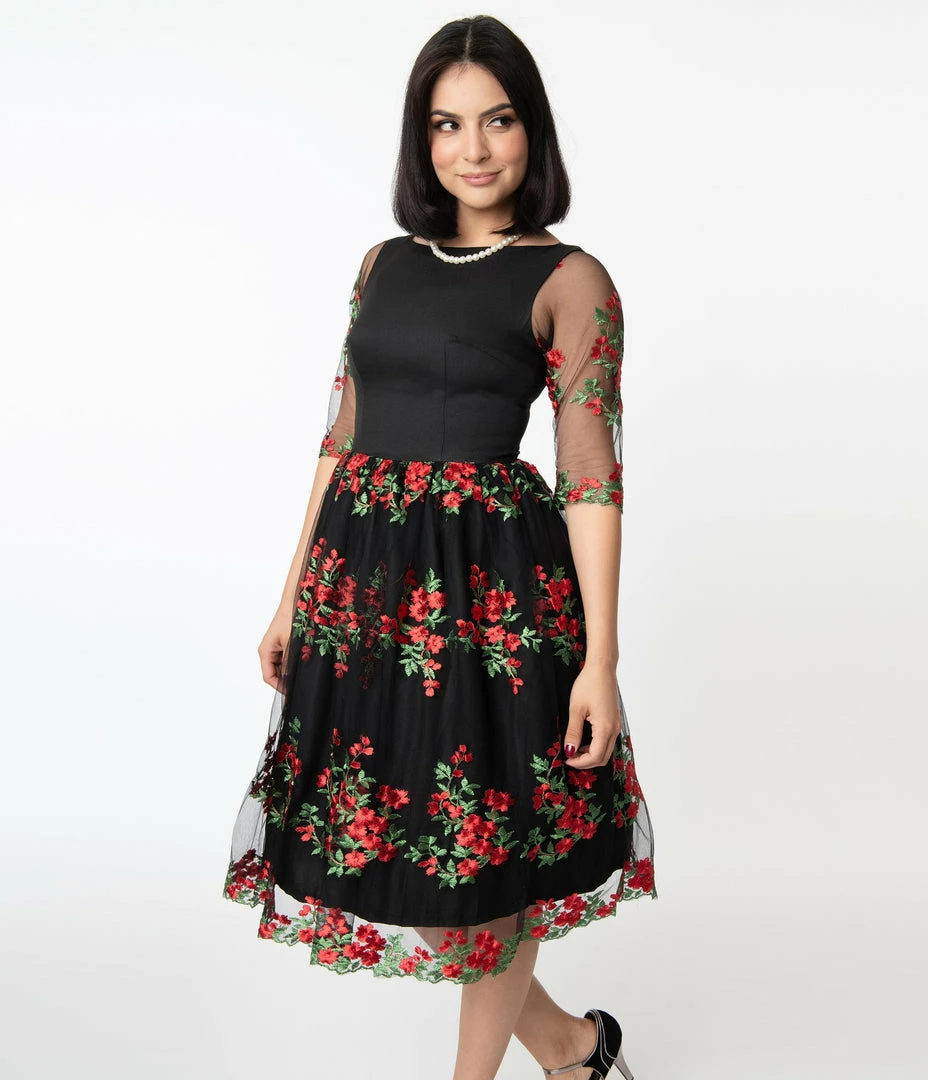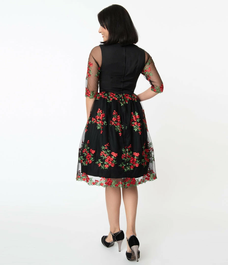 Bring a rush to their hearts, darling! A heavenly silhouette in mid-century styling that boasts a gathered skirt of black mesh, dancing with red embroidered florals and green leaves. The darted bodice is topped by a bateau neckline and framed by flirtatious sheer three-quarter length sleeves. The seamed waist is nipped in with a back zipper as the swing skirt drops to your knees. It’s simply sublime!