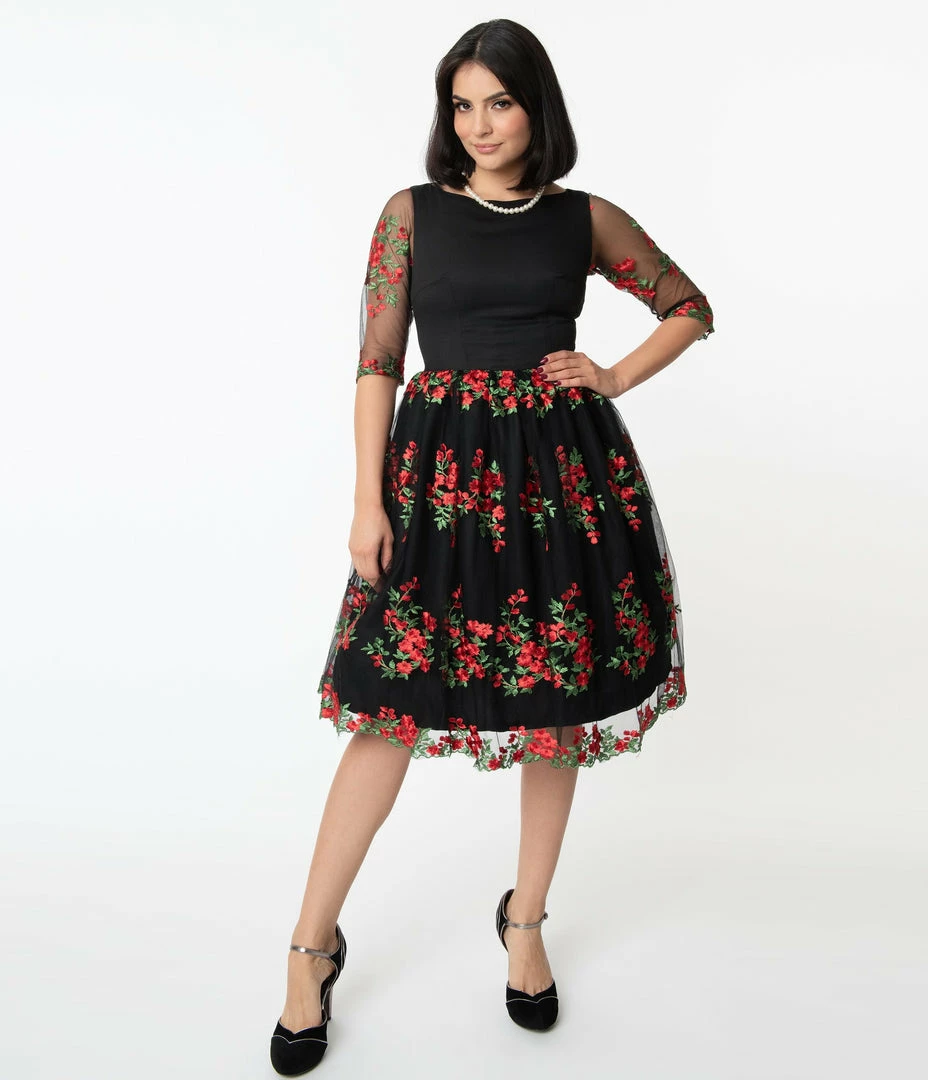 Best Sale 🎉 Magnolia Place Black Mesh & Red Embroidered Florals Sleeved Audrey Swing 👗 Dress Sale 😉