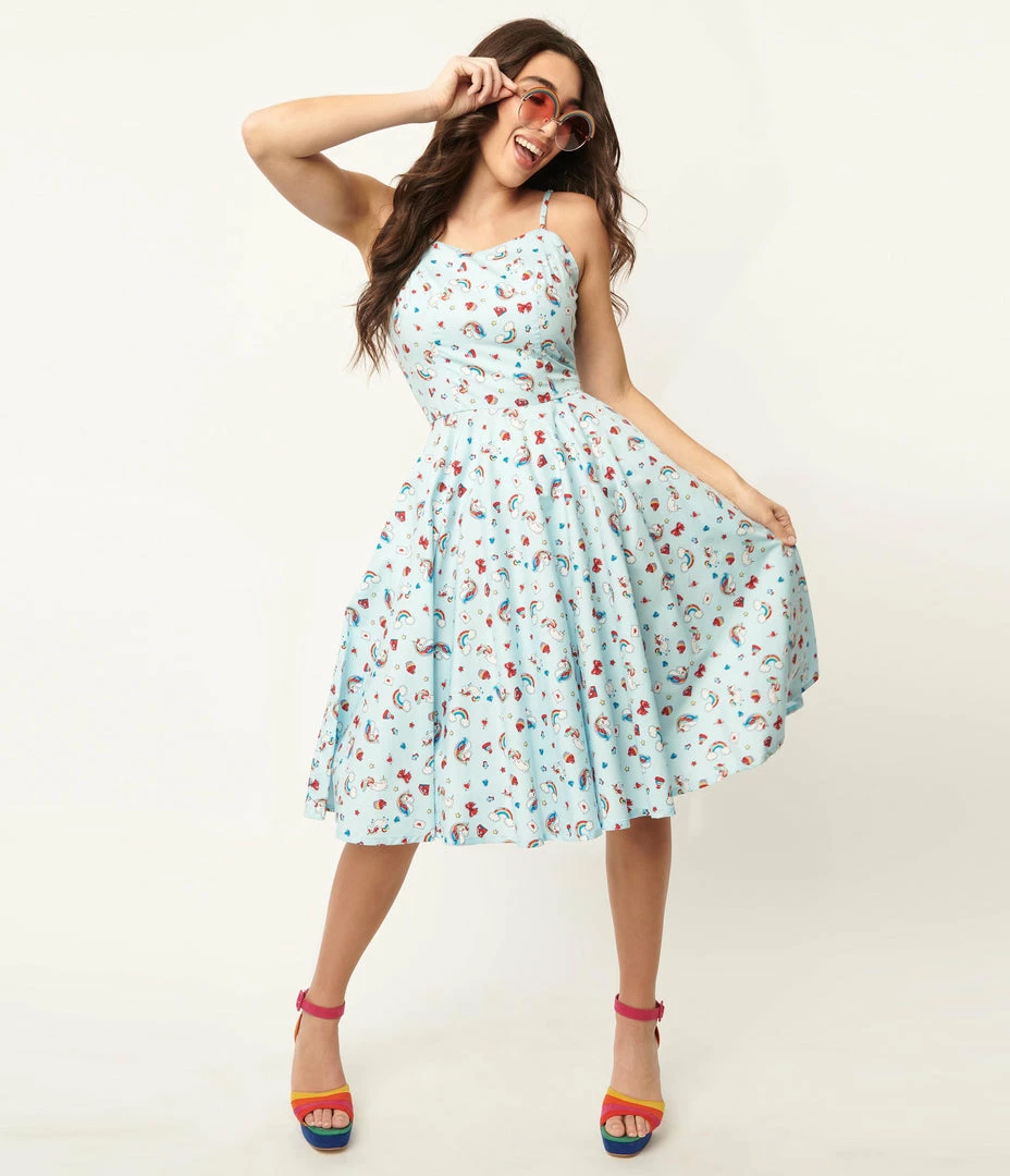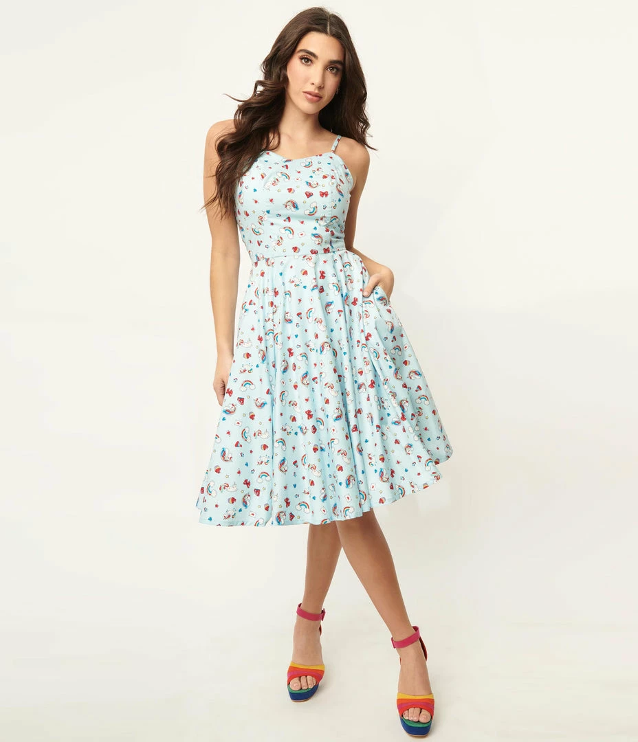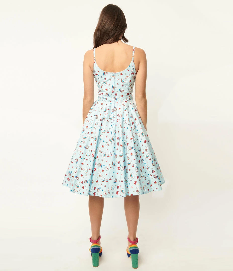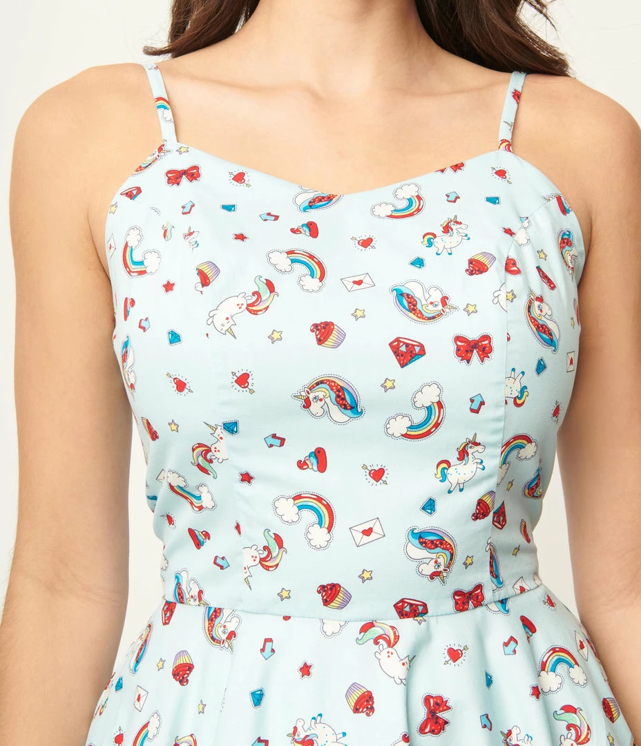 An adorable swing dress, crafted in lightweight cotton and dancing with a charming print of unicorns, rainbows, unicorn cats, gemstones, love letters, cupcakes, and stars dancing throughout the light blue backdrop. Adjustable straps secure the sweetheart neckline as the seamed waist is cinched with a back zipper. Complete with side pockets in the fabulous swing skirt!
